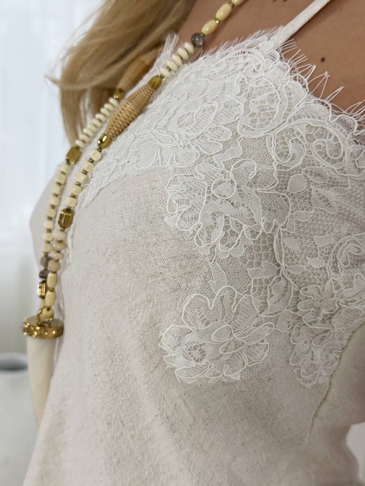 Denne feminine top er udført i blød hør look, som giver et elegant og eksklusivt udtryk. Modellen har fine, justerbare stropper og smukke blonder, der diskret pryder udskæringen og skaber et romantisk look. Micro suede-kvaliteten føles behagelig mod huden og falder flot uden at virke tung. Toppen er ideel både som del af et gennemført sæt eller stylet alene med bukser, nederdel eller under en kimono. En alsidig og tidløs top, der passer perfekt til både hverdag og særlige anledninger.