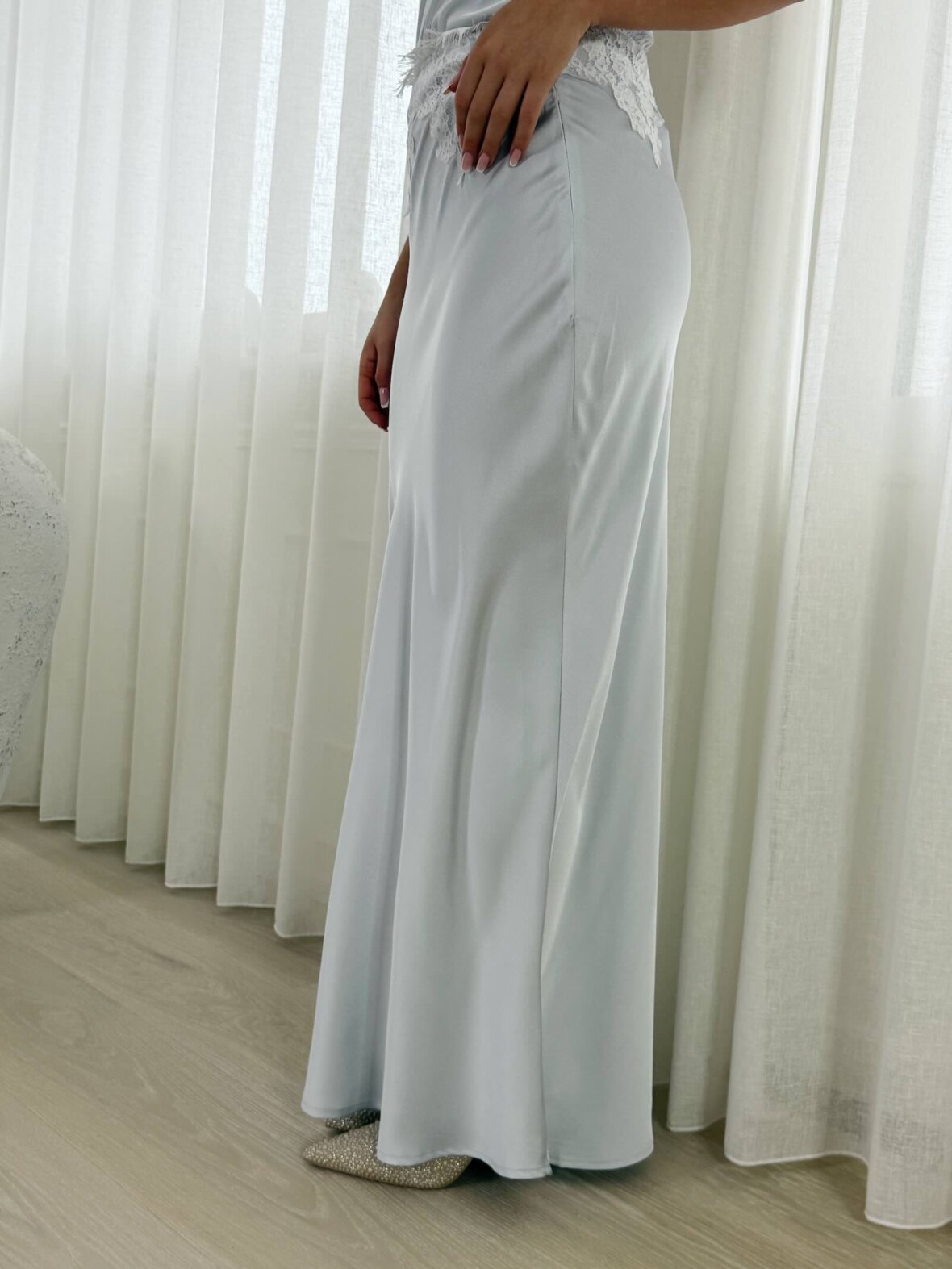 Denne lange nederdel i lys blå har et let og elegant udtryk med et smukt, glansfuldt satinlook. Den høje talje er udsmykket med fine blondedetaljer, som tilfører et feminint og eksklusivt touch. Nederdelen falder blødt og naturligt langs kroppen og skaber en flatterende, lang silhuet. Den lyse blå nuance giver et friskt og sofistikeret udtryk, som er nemt at style med både lyse og neutrale toner. En elegant nederdel, der fungerer perfekt til både festlige anledninger og stilfulde hverdagslooks.