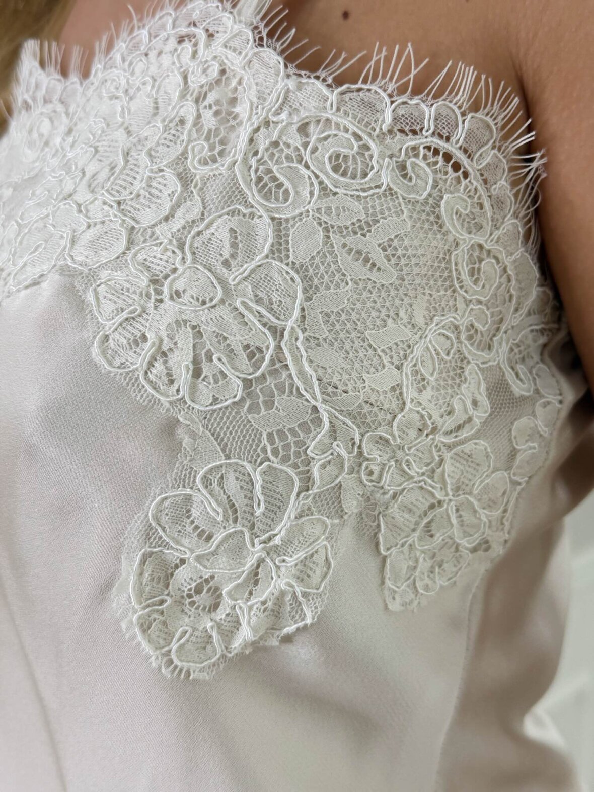 Elegant og feminin top i smuk cream nuance med fine blonde-detaljer ved udskæringen. Den lette, bløde kvalitet falder flot på kroppen og de smalle stropper giver et eksklusivt og delikat udtryk. Perfekt både alene til sommerens looks eller under blazer og strik for et mere sofistikeret lag-på-lag outfit. En tidløs garderobefavorit med romantisk twist.