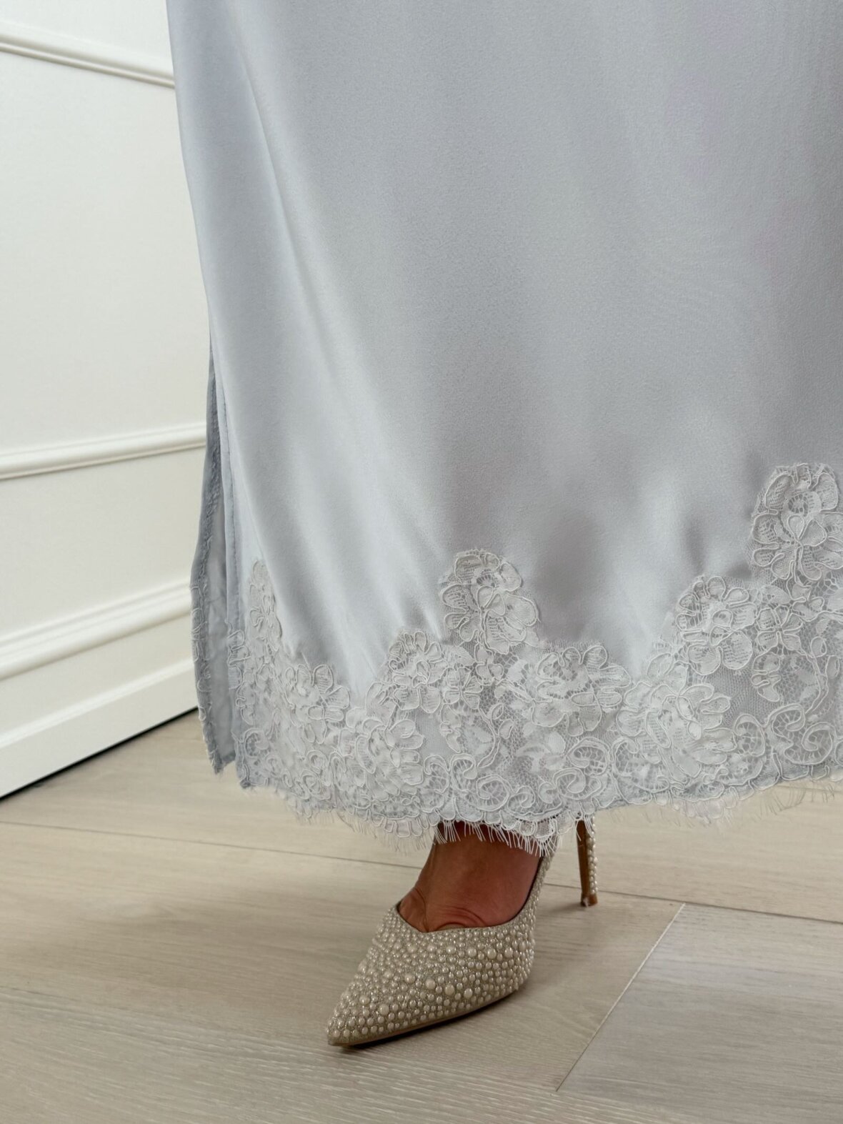 Denne lyseblå satin kjole med blonde fra Buch Copenhagen er en feminin og elegant kjole med let og eksklusivt udtryk. Den bløde satin falder smukt langs kroppen, mens blonde-detaljerne ved udskæring og kant tilfører et romantisk og raffineret look. Kjolen har en flatterende pasform med smalle justerbare stropper. Perfekt til fest, ferie og elegante hverdage, hvor den kan styles med blazer eller strik for et stilfuldt outfit.