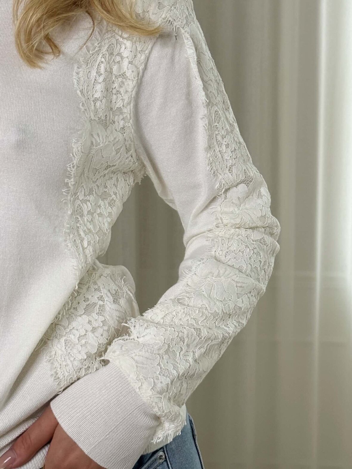 Elegant cremefarvet cardigan med smukke blondepaneler på ærmer og sider, der skaber et feminint og eksklusivt udtryk. De gyldne knapper tilfører et sofistikeret touch, mens den bløde kvalitet sikrer komfort hele dagen. Perfekt over toppe, kjoler og bluser – både til hverdag og særlige anledninger.