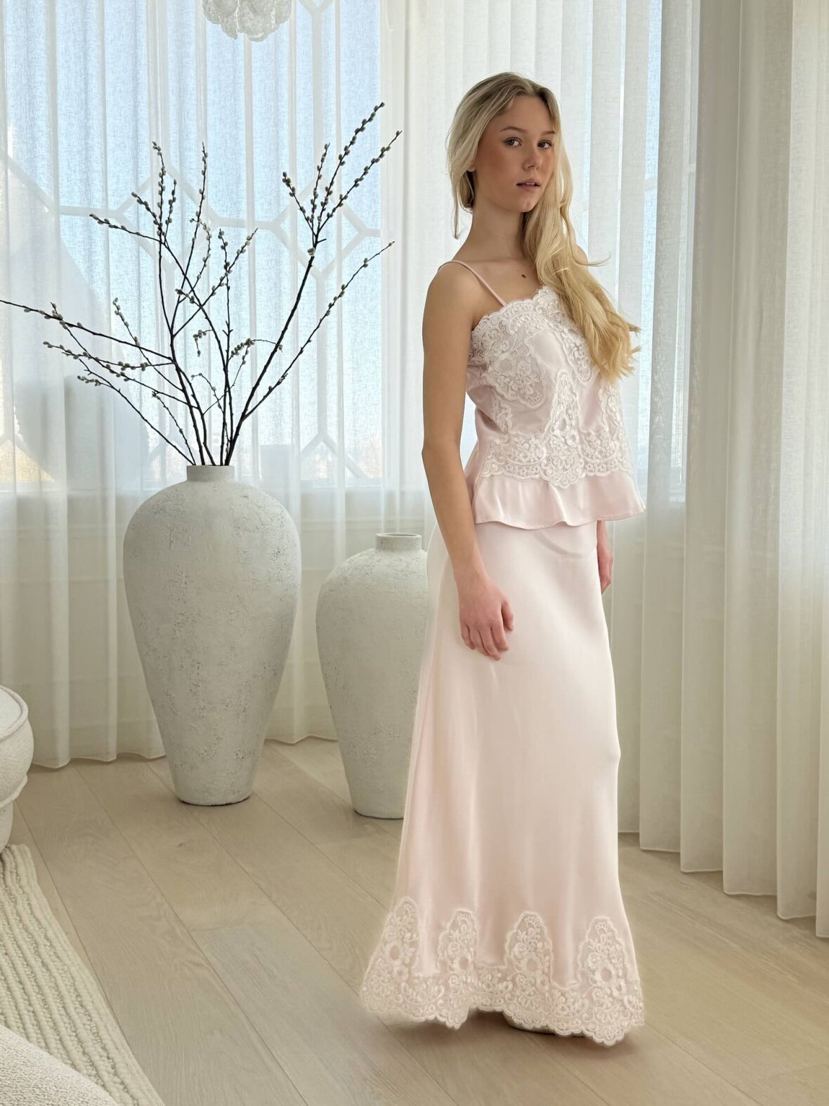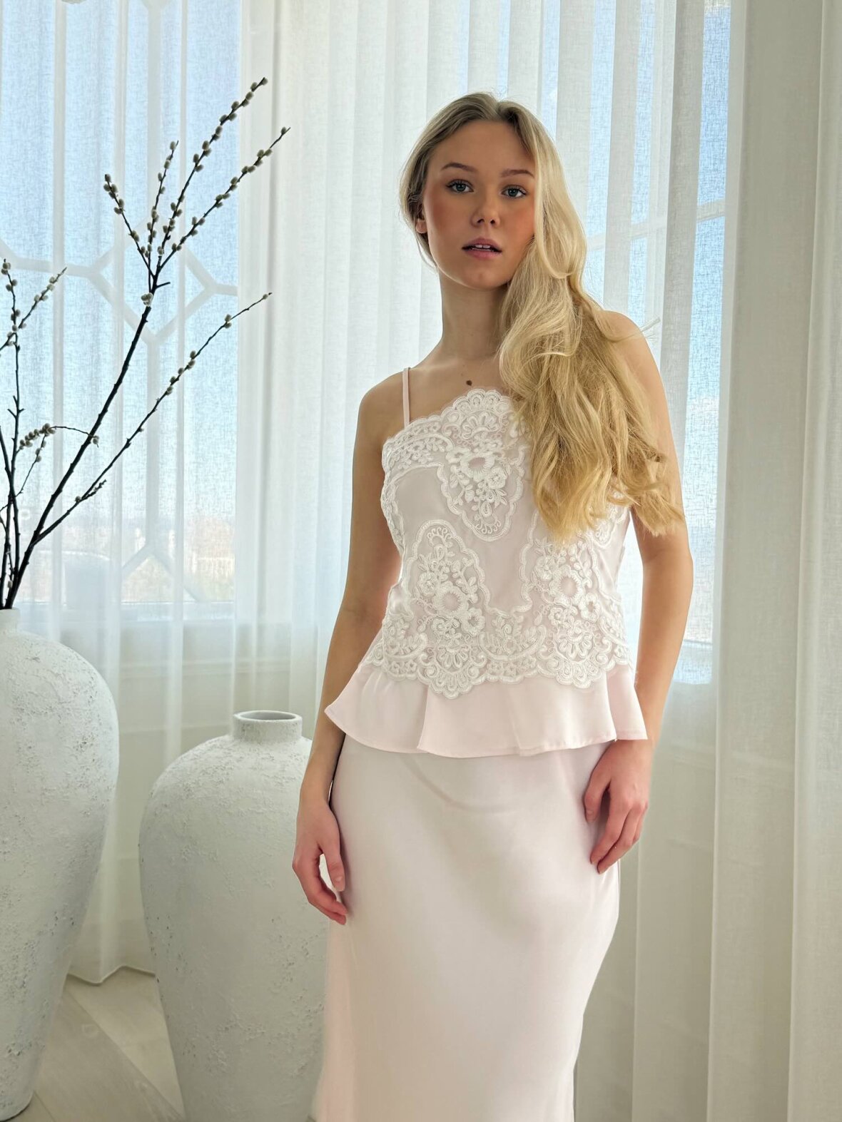 Denne lyserøde satin top med blonde fra Buch Copenhagen er en feminin og elegant top med eksklusivt og raffineret udtryk. Den smukke blonde foran skaber et romantisk look, mens den bløde satin giver en let og behagelig følelse. Toppen har en flatterende pasform med smalle justerbare stropper og let peplum-effekt forneden. Perfekt til både fest og stilfulde hverdage, hvor den kan styles med bukser, nederdel eller blazer.
