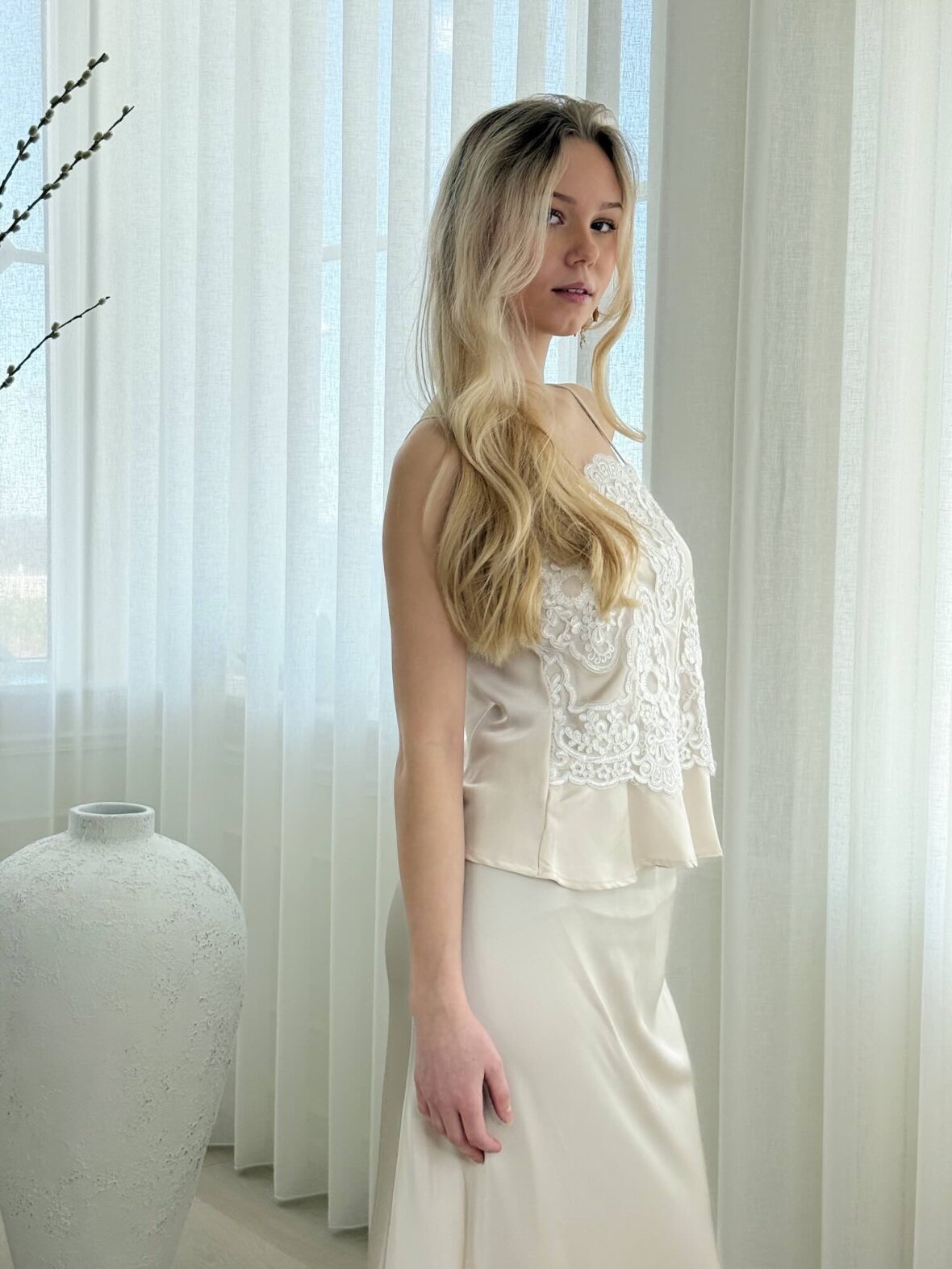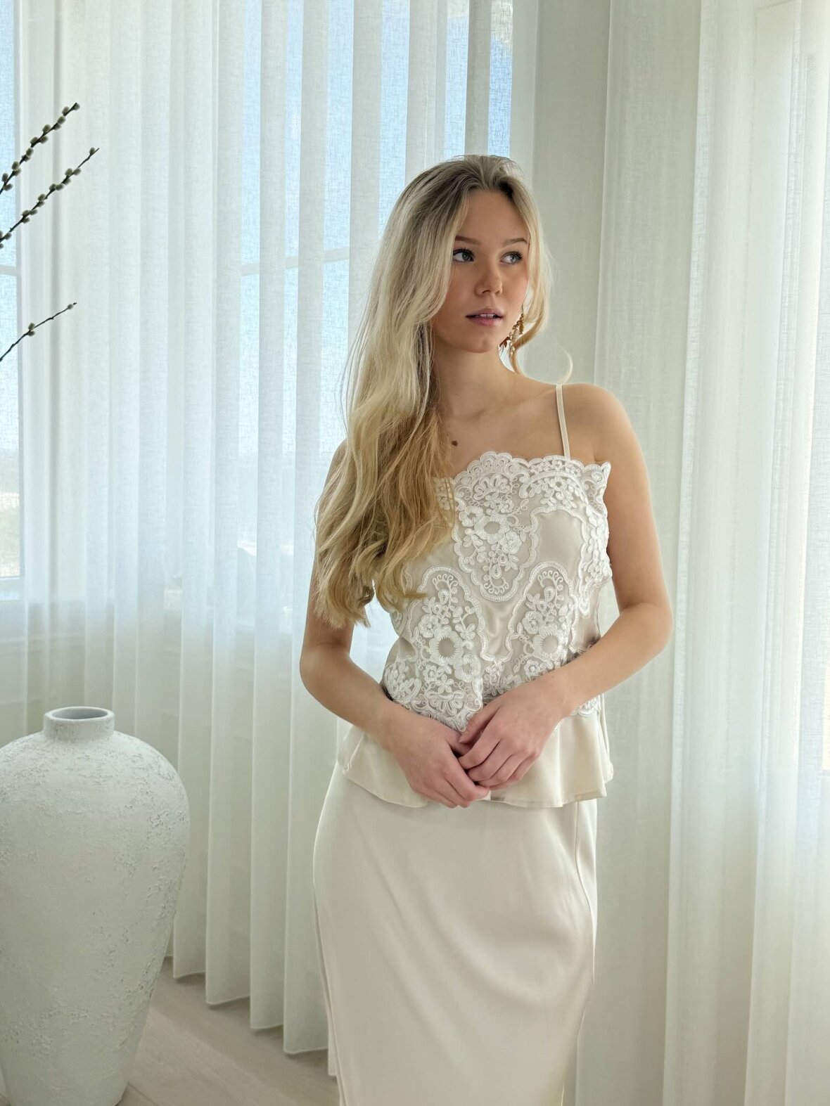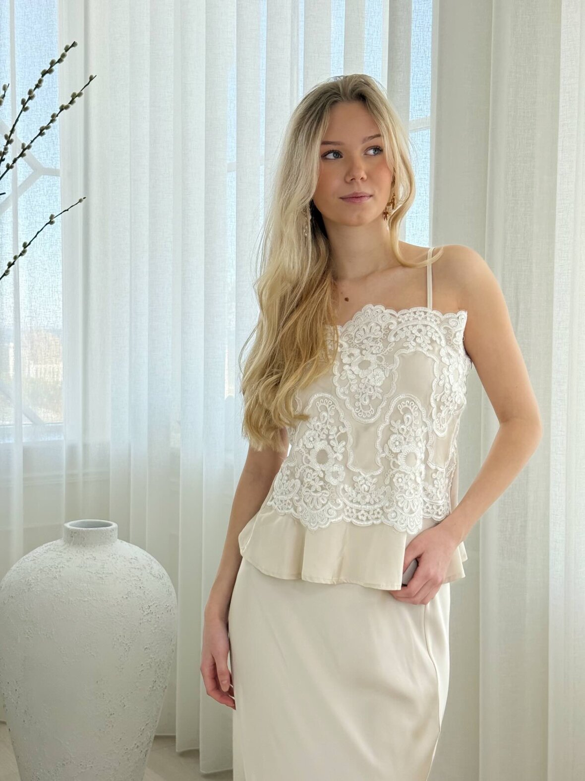 Denne creme satin top med blonde fra Buch Copenhagen er en feminin og elegant top med eksklusivt og raffineret udtryk. Den detaljerede blonde foran giver et romantisk look, mens den bløde satin sikrer en let og behagelig følelse. Toppen har en flatterende pasform med smalle justerbare stropper og let peplum-effekt forneden. Perfekt til både fest og stilfulde hverdage, hvor den kan styles med bukser, nederdel eller blazer.