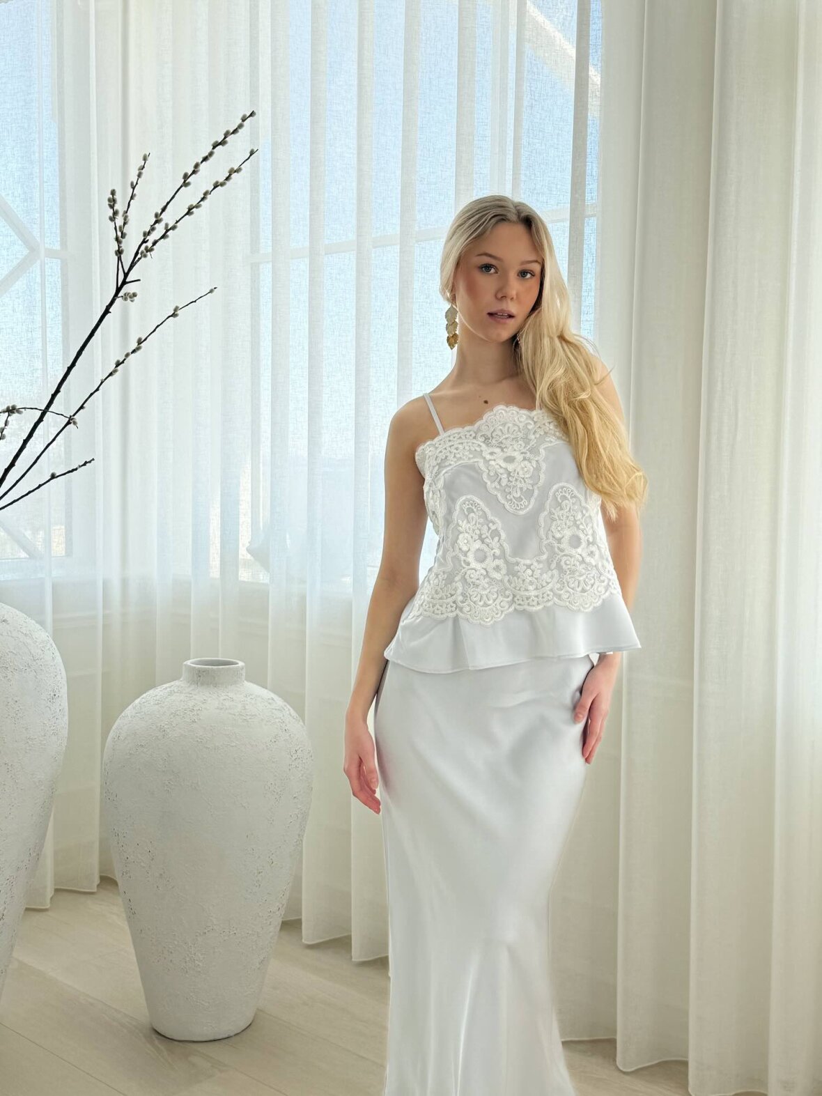 Denne lyseblå satin top med blonde fra Buch Copenhagen er en feminin og elegant top med eksklusivt og raffineret udtryk. Den detaljerede blonde foran skaber et romantisk look, mens den bløde satin giver en let og behagelig følelse. Toppen har en flatterende pasform med smalle justerbare stropper og let peplum-effekt forneden. Perfekt til både fest og stilfulde hverdage, hvor den kan styles med bukser, nederdel eller blazer.