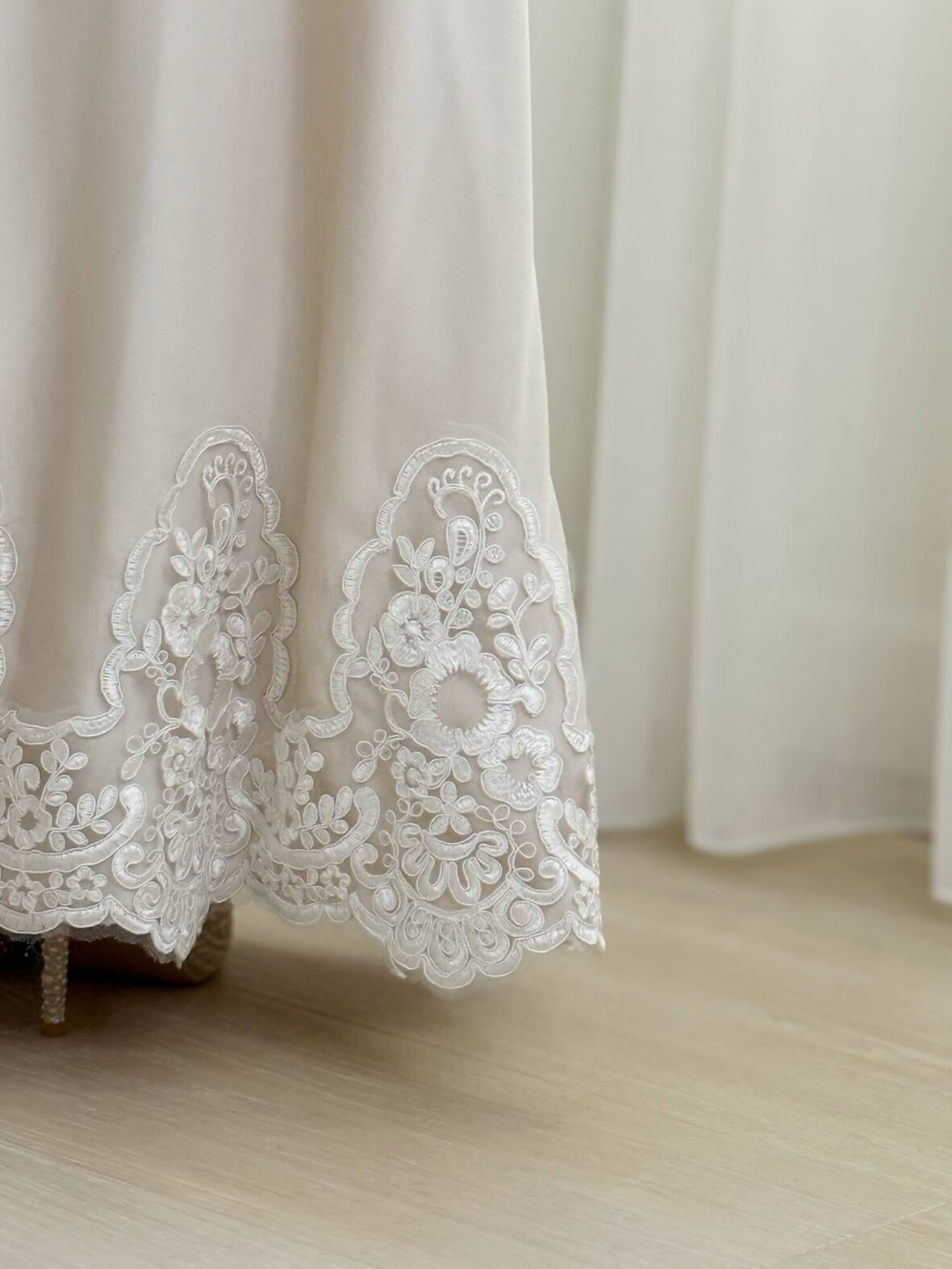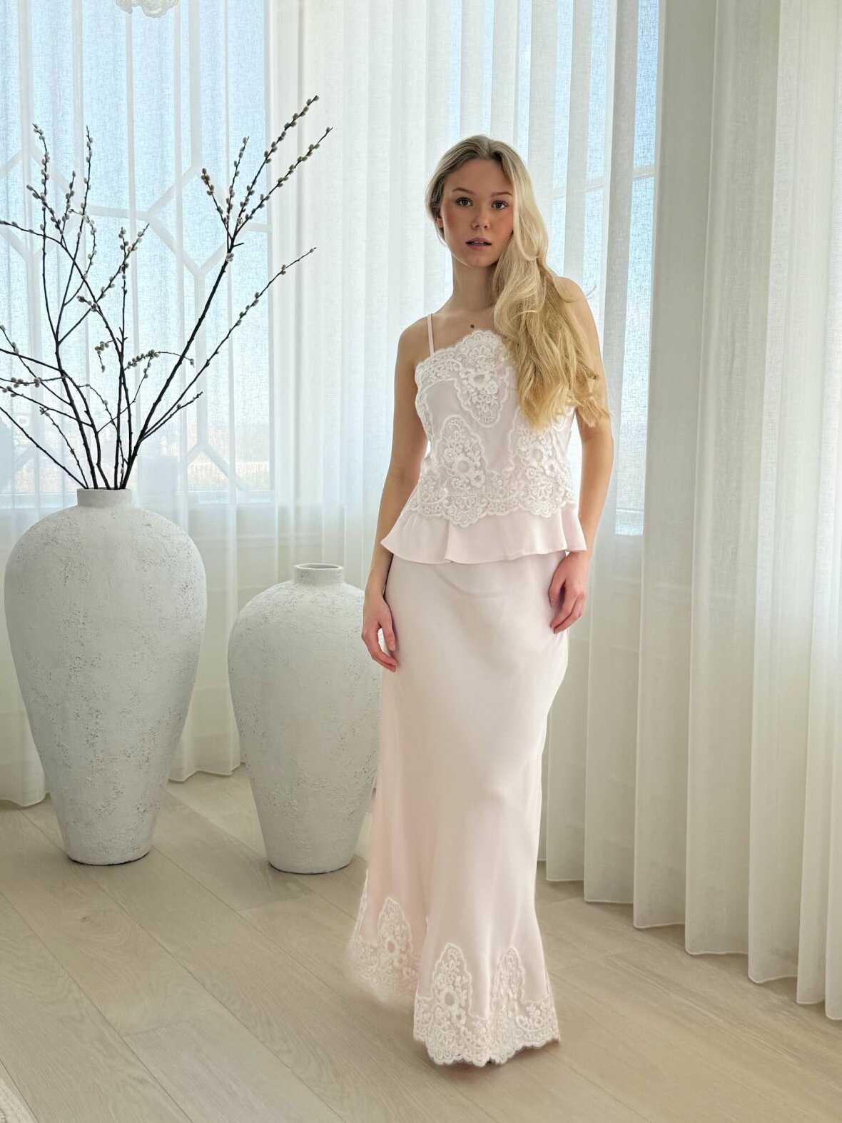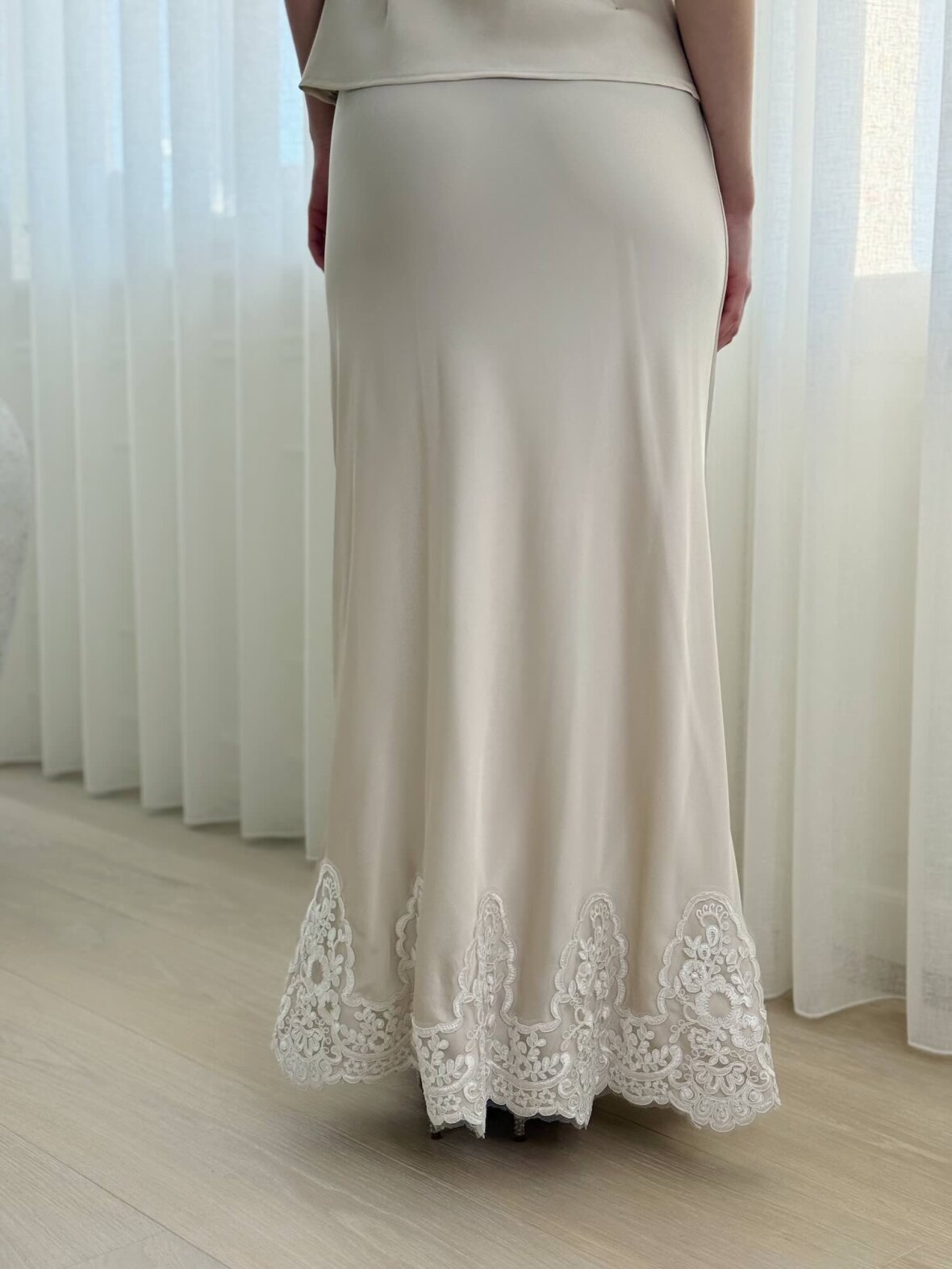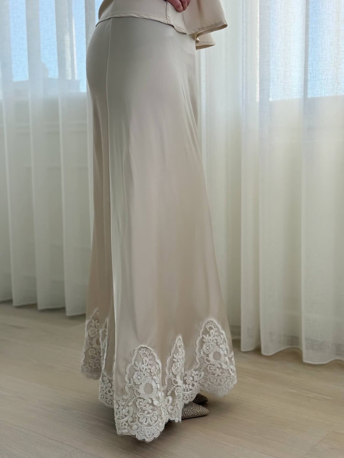 Denne beige satin nederdel med blonde fra Buch Copenhagen er en feminin og elegant nederdel med eksklusivt og let udtryk. Den bløde satin falder smukt og skaber en flatterende silhuet, mens blondekanten forneden tilfører et romantisk og raffineret look. Nederdelen har en behagelig pasform med elastisk talje. Perfekt til både hverdag og fest, hvor den kan styles med top, skjorte eller strik for et stilfuldt outfit.