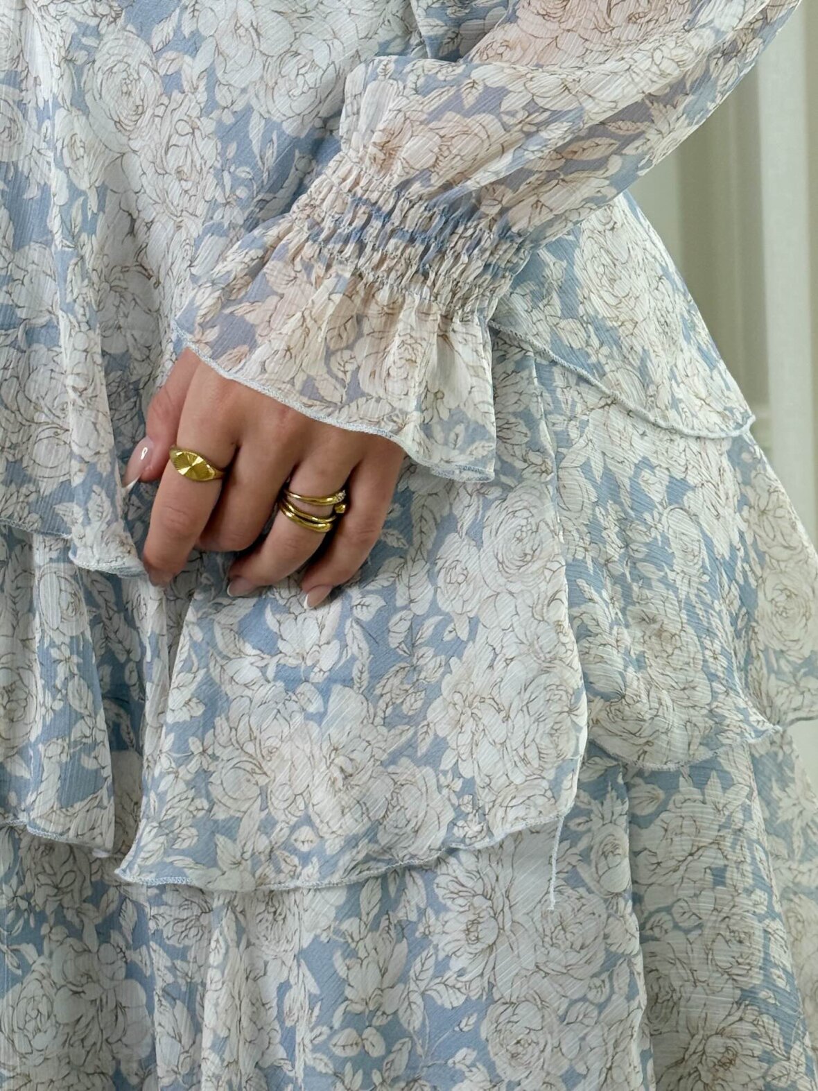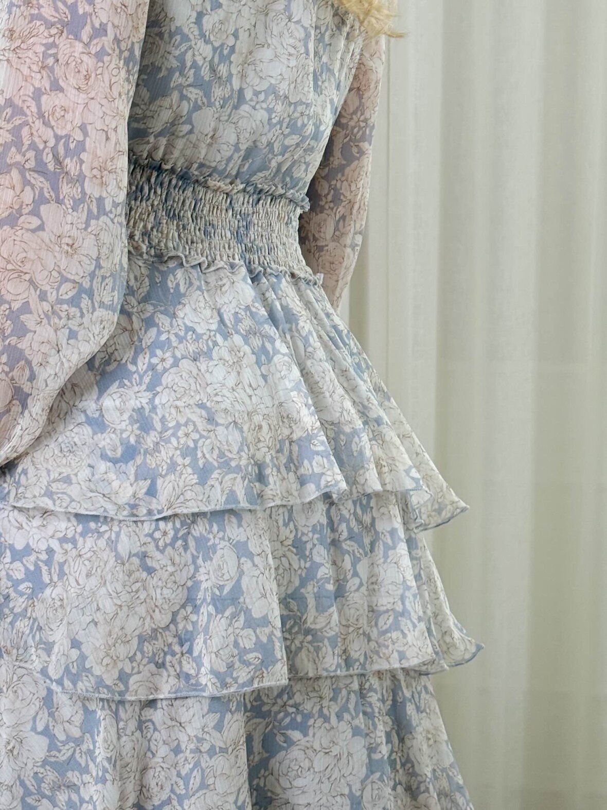 Denne lyseblå blomstrede kjole fra Buch Copenhagen er en feminin og elegant kjole med let og eksklusivt udtryk. Det luftige materiale og de smukke flæselag skaber en flatterende og bevægelig silhuet, mens den elastiske talje fremhæver figuren. Kjolen har lange ærmer og v-udskæring, der giver et romantisk look. Perfekt til både fest, ferie og stilfulde hverdage, hvor den kan styles med sandaler eller støvler.