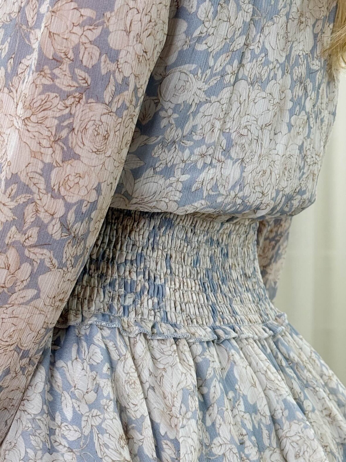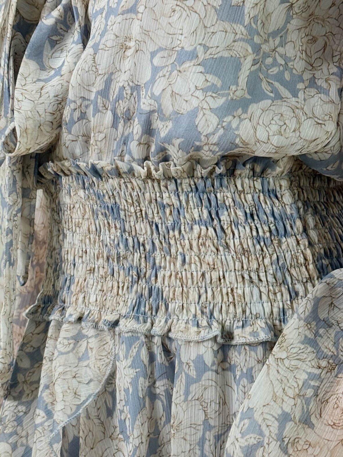 Denne lyseblå blomstrede kjole fra Buch Copenhagen er en feminin og elegant kjole med let og luftigt udtryk. Det fine blomsterprint og de smukke flæselag skaber en flatterende silhuet, mens smock-detaljen i taljen fremhæver figuren. Kjolen har lange ærmer og bindebånd ved udskæringen, der tilfører et romantisk touch. Perfekt til både hverdag og fest, hvor den kan styles med sandaler eller støvler for et stilfuldt outfit.