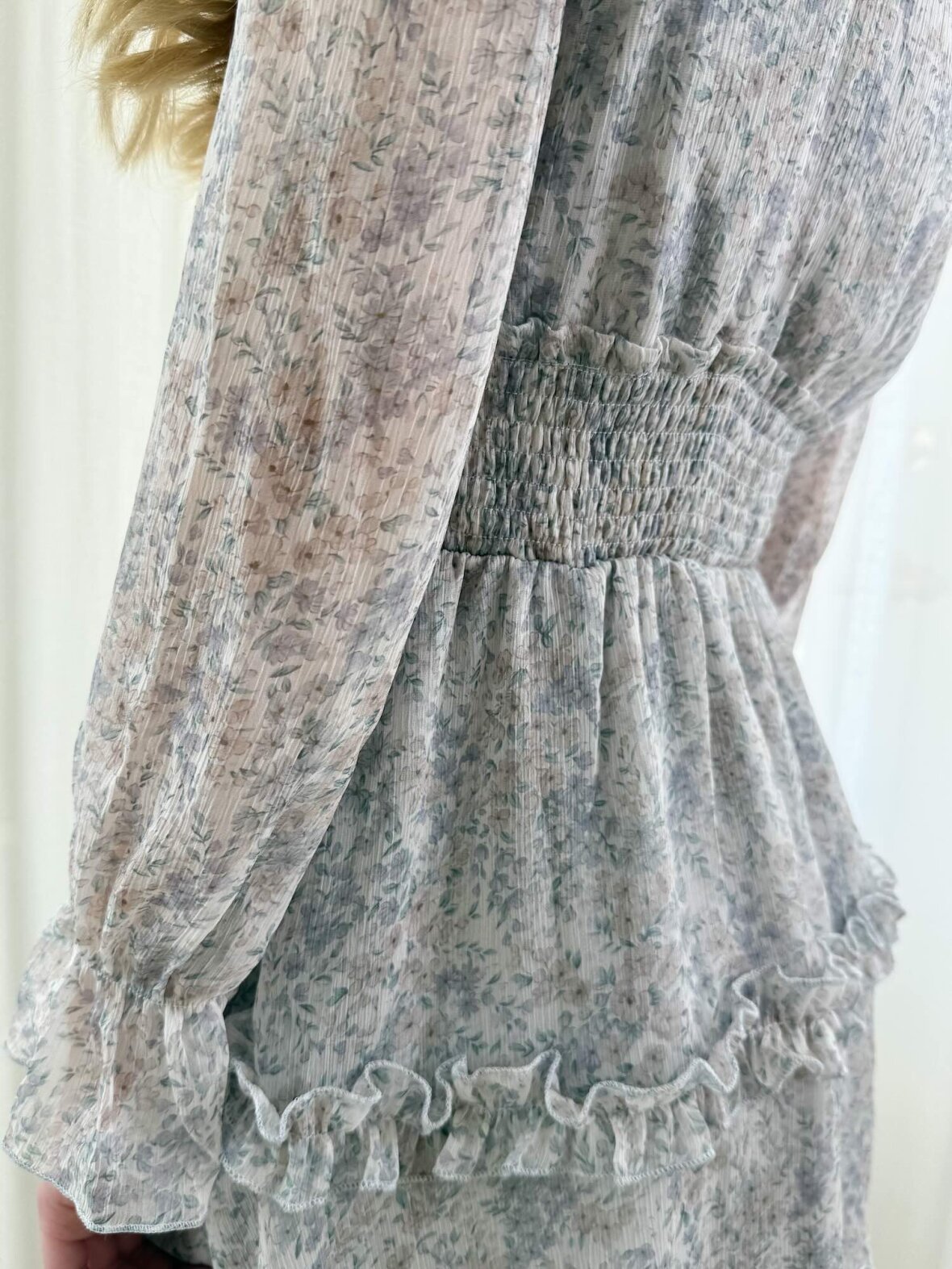 Denne lyseblå blomstrede kjole fra Buch Copenhagen er en feminin og elegant kjole med let og luftigt udtryk. Det fine print og de smukke flæsedetaljer skaber en romantisk og flatterende silhuet. Kjolen har lange ærmer og v-udskæring, der fremhæver et feminint look. Perfekt til både hverdag og fest, hvor den kan styles med sandaler, støvler eller blazer for et stilfuldt og elegant outfit.