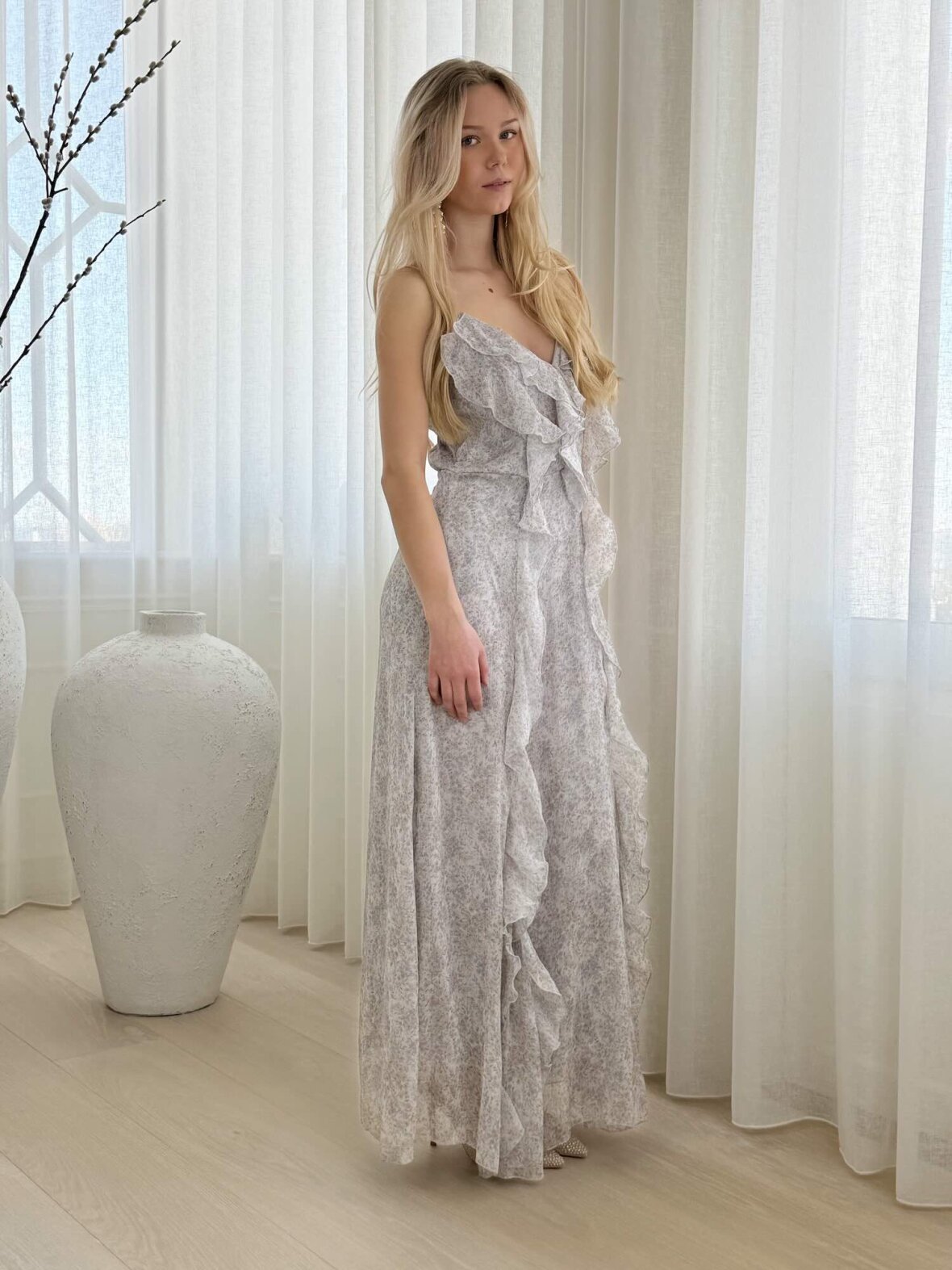 Denne lyseblå blomstrede kjole fra Buch Copenhagen er en feminin og elegant kjole med let og eksklusivt udtryk. De smukke flæsedetaljer foran skaber en flatterende og bevægelig silhuet, mens det lette materiale giver et luftigt look. Kjolen har smalle justerbare stropper og en elegant længde. Perfekt til fest, ferie og sommerens særlige øjeblikke, hvor den kan styles med sandaler eller hæle.