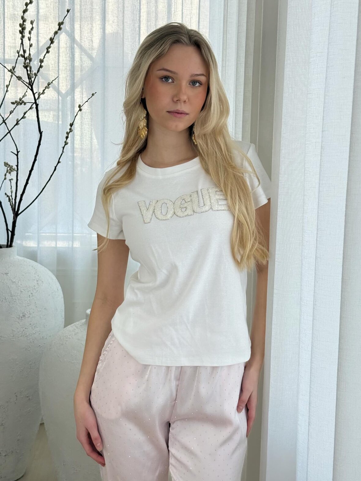 Denne hvide VOGUE t-shirt fra Buch Copenhagen er en feminin og stilfuld t-shirt med moderne og elegant udtryk. Den bløde bomuld giver høj komfort, mens VOGUE-printet foran tilfører et eksklusivt og trendy look. T-shirten har en flatterende pasform med korte ærmer, der gør den nem at style. Perfekt til både hverdag og afslappede outfits, hvor den kan styles med jeans, nederdel eller blazer.
