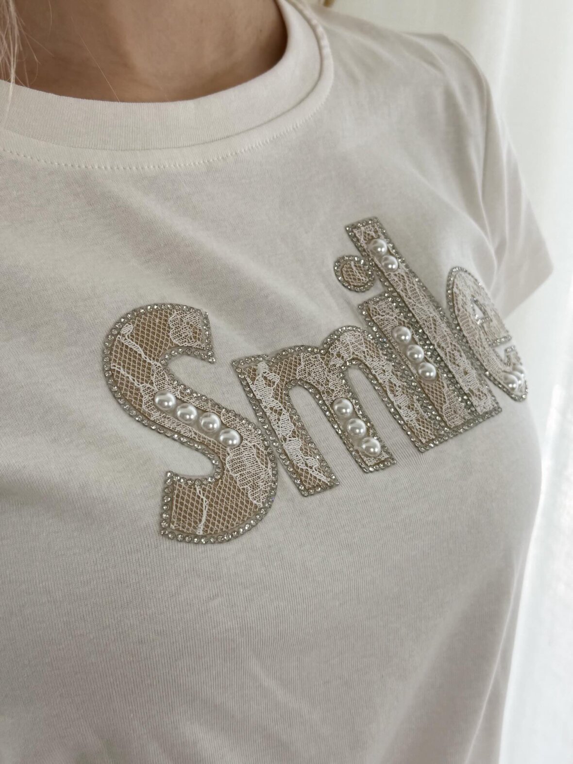 Denne hvide Smile t-shirt fra Buch Copenhagen er en feminin og stilfuld t-shirt med moderne og elegant udtryk. Den bløde bomuld giver høj komfort, mens Smile-printet foran tilfører et eksklusivt og trendy look. T-shirten har en flatterende pasform med korte ærmer, der gør den nem at style. Perfekt til både hverdag og afslappede outfits, hvor den kan styles med jeans, nederdel eller blazer.