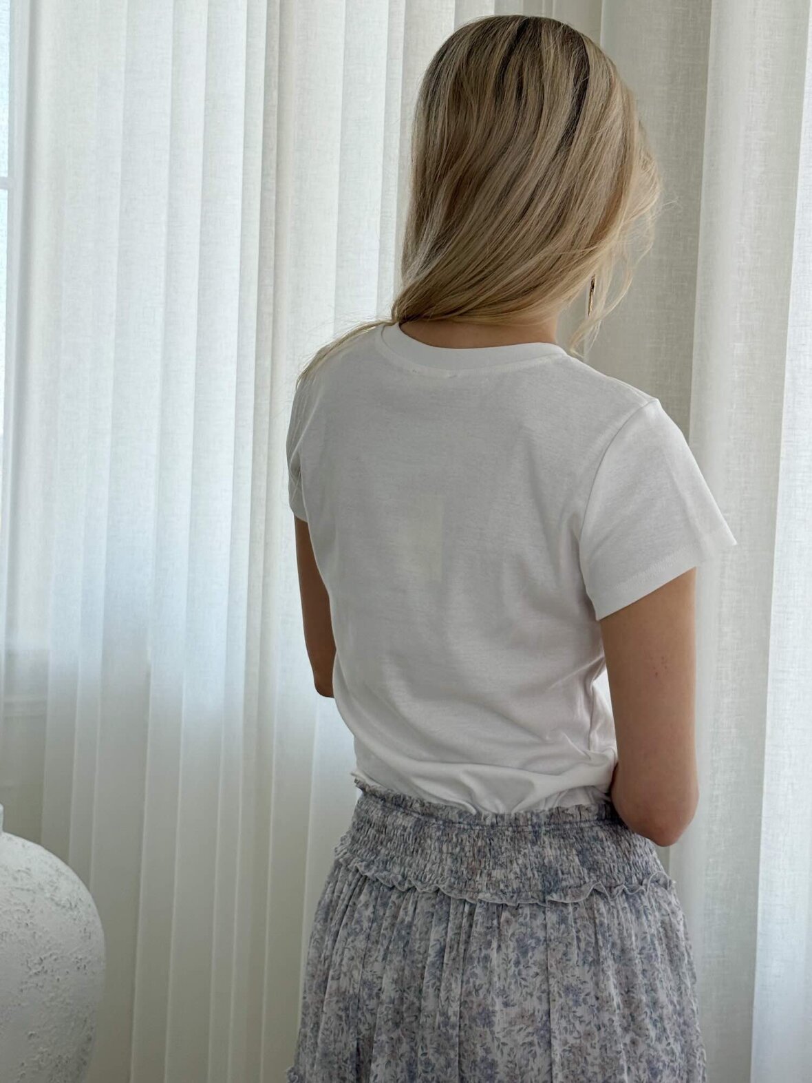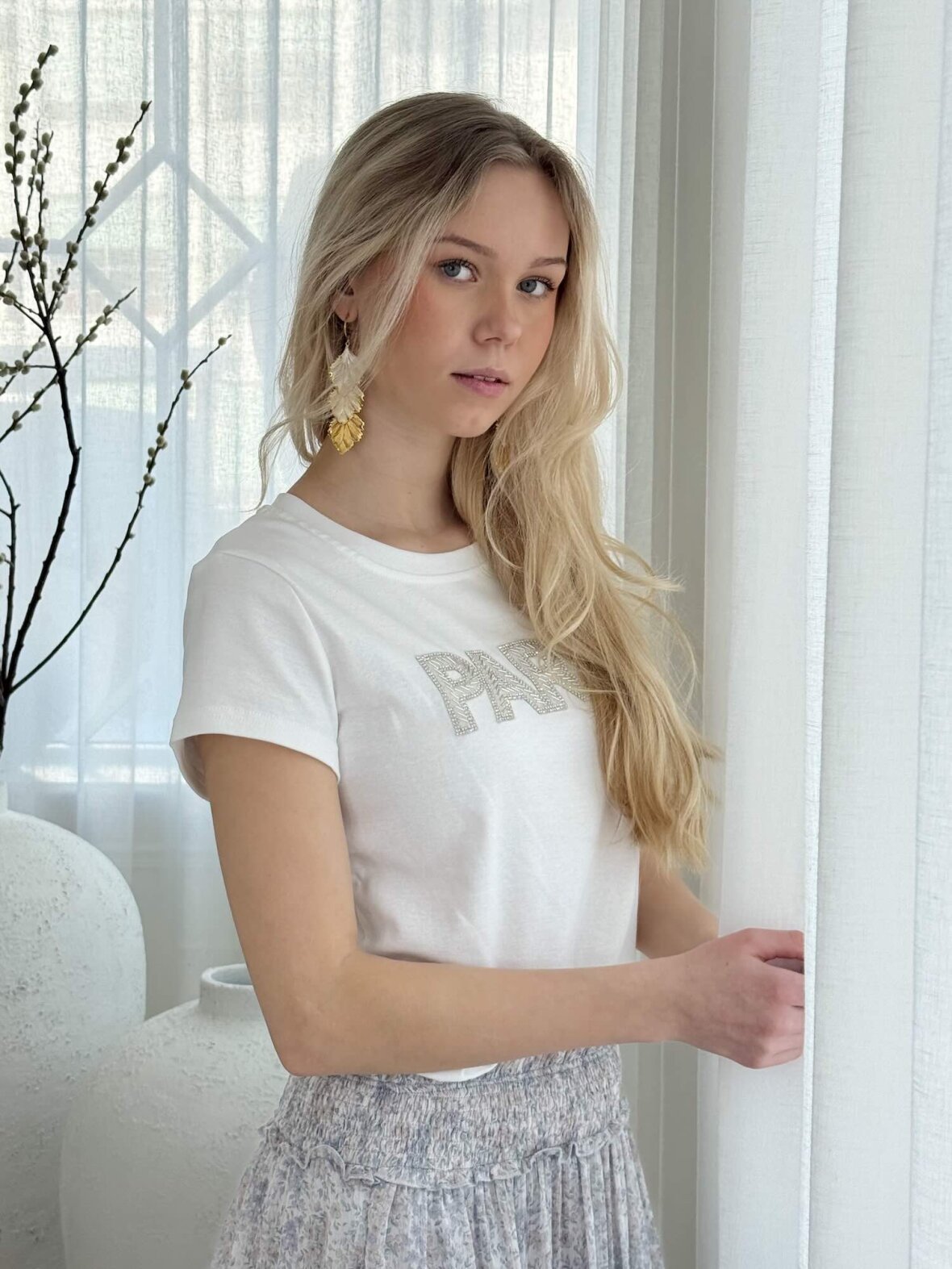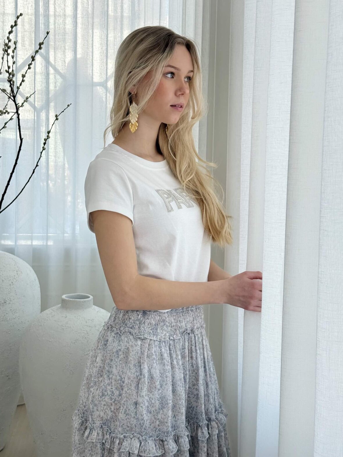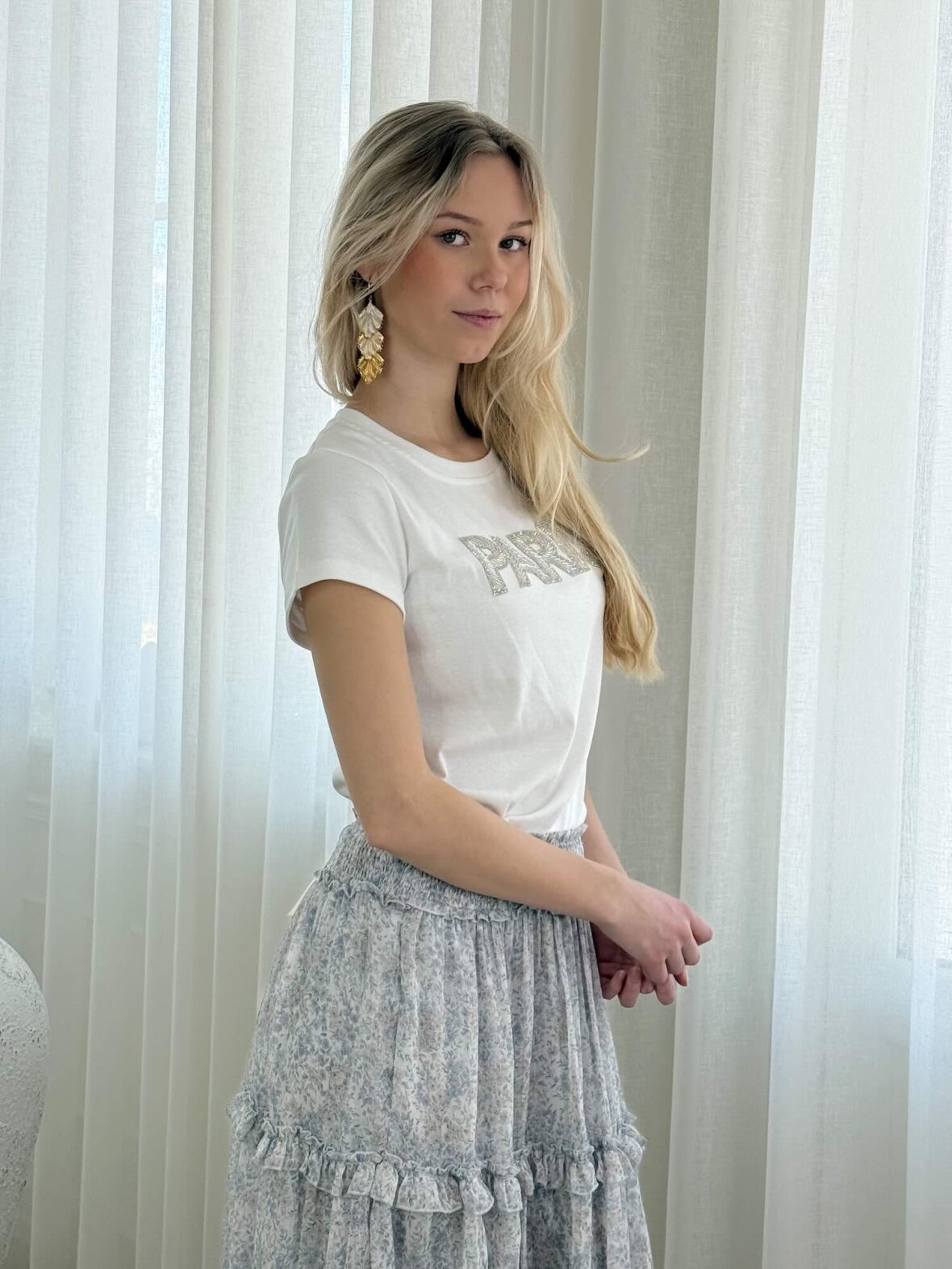 Denne hvide PARIS t-shirt fra Buch Copenhagen er en feminin og stilfuld t-shirt med moderne og elegant udtryk. Den bløde bomuld giver høj komfort, mens PARIS-printet foran tilfører et eksklusivt og trendy look. T-shirten har en flatterende pasform med korte ærmer, der gør den nem at style. Perfekt til både hverdag og afslappede outfits, hvor den kan styles med jeans, nederdel eller blazer.