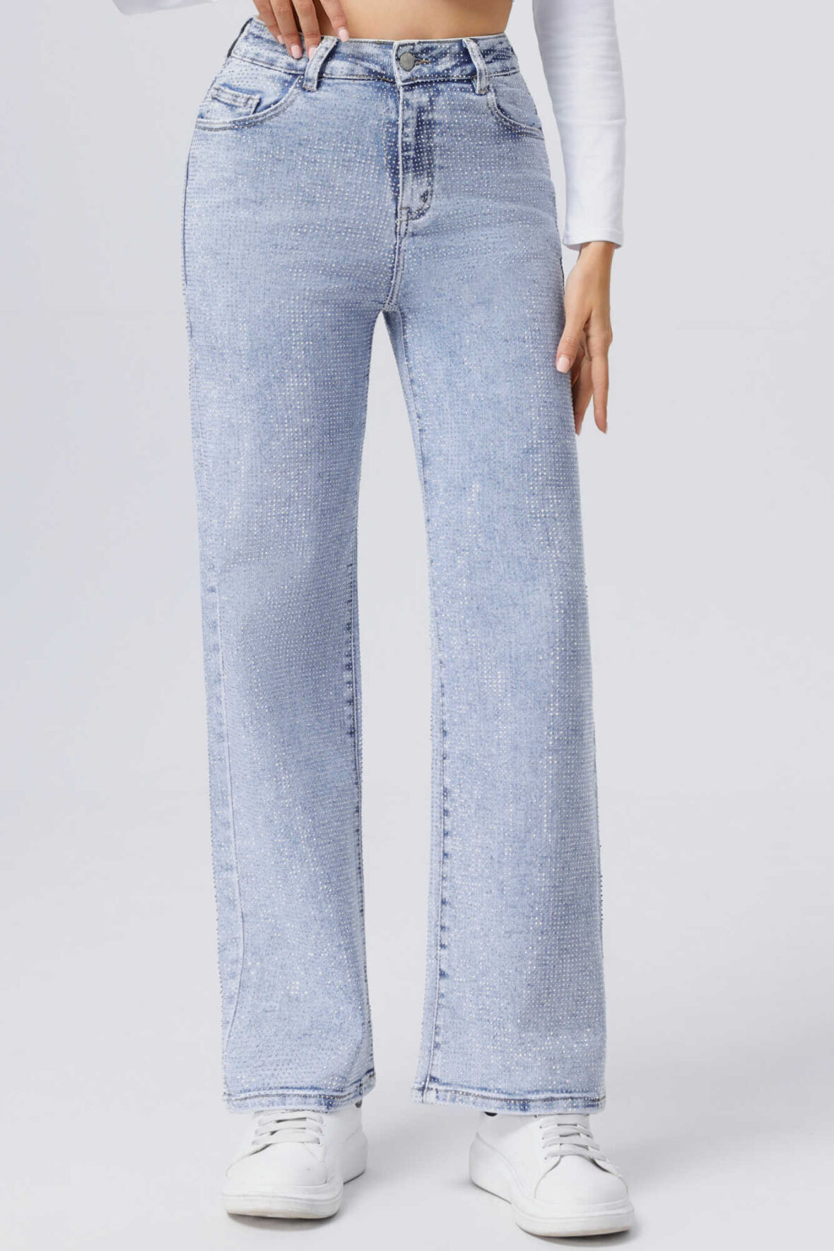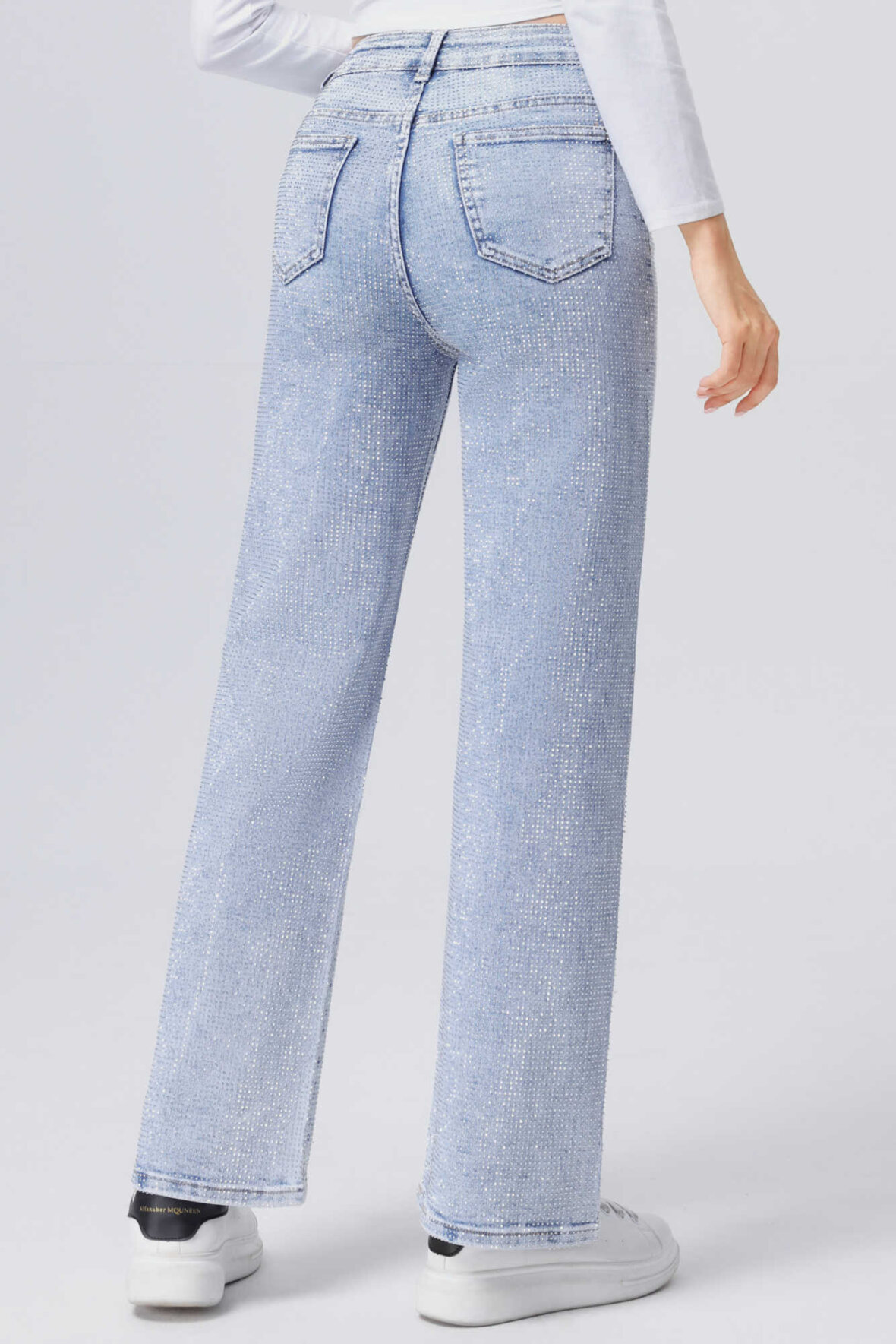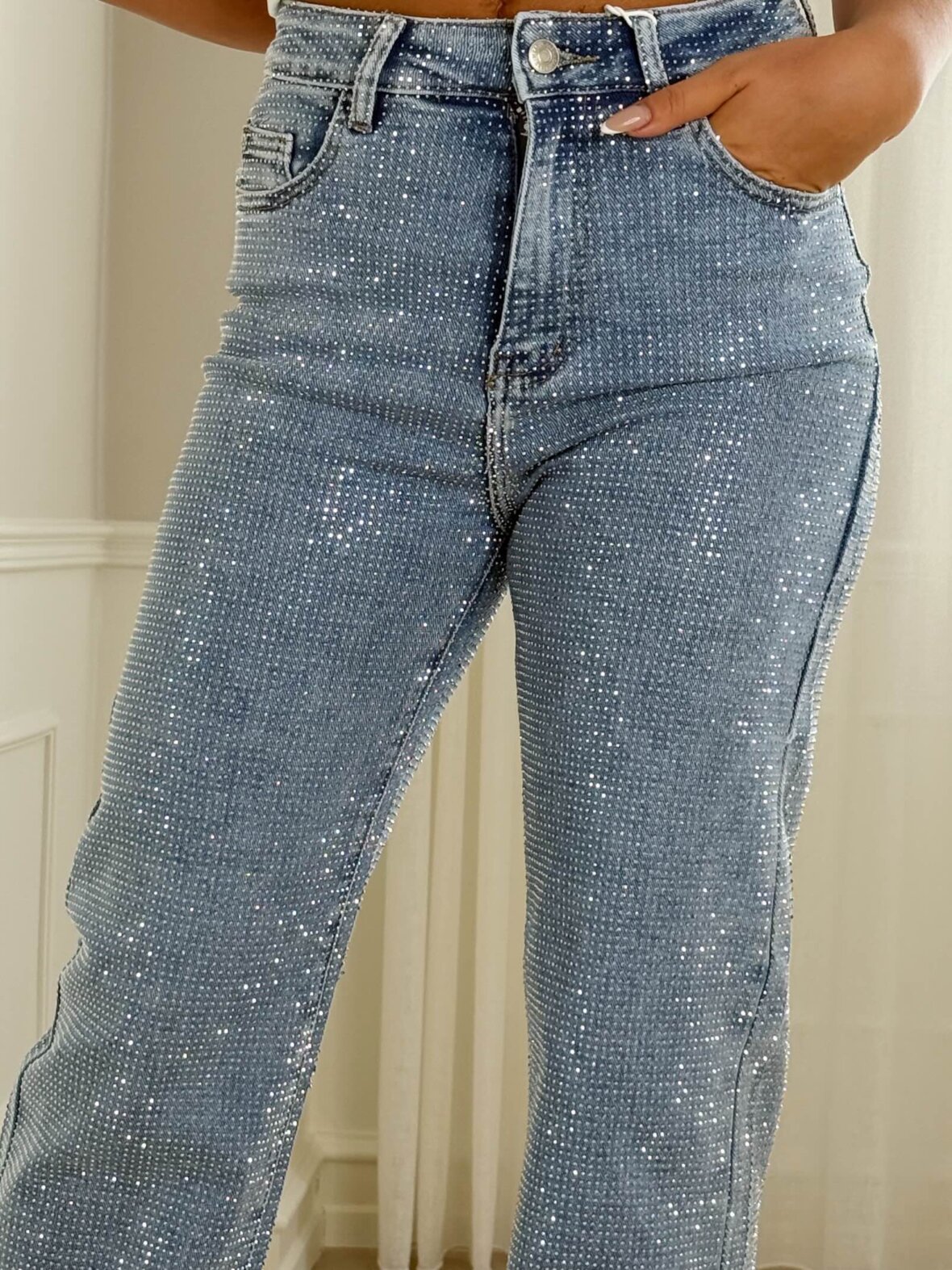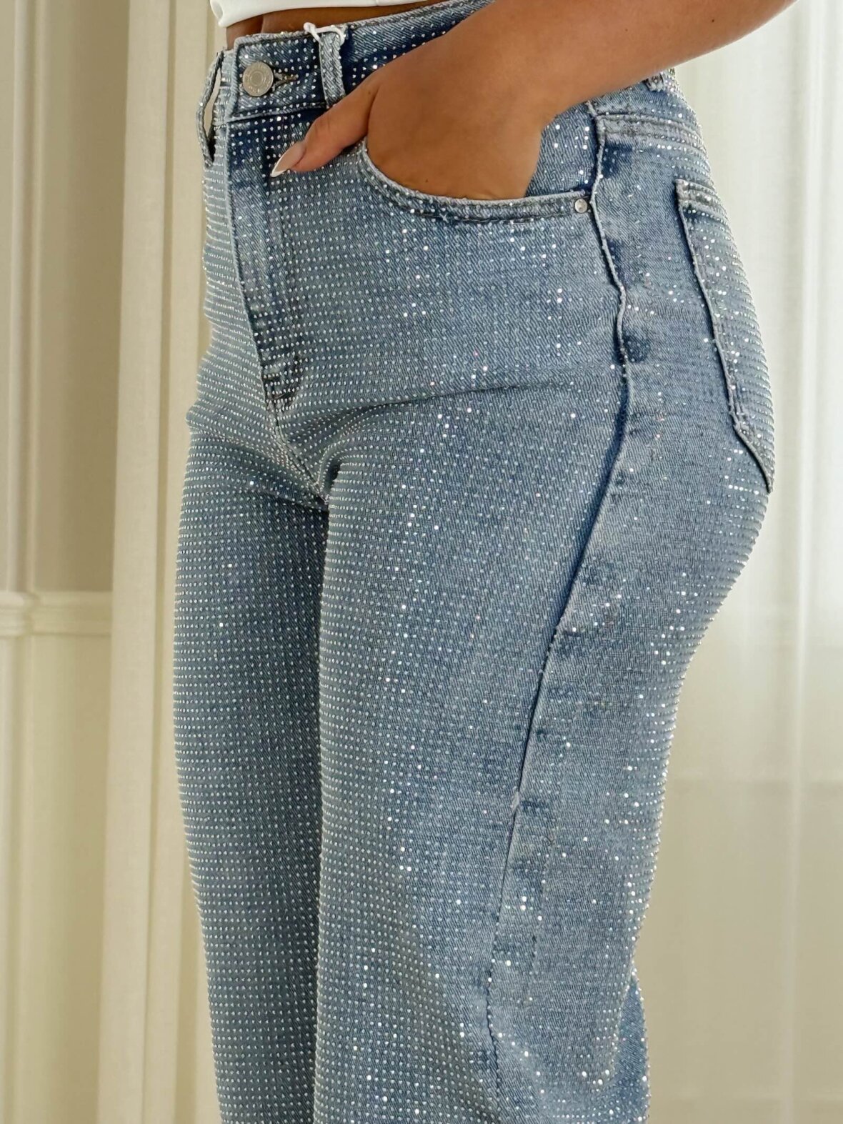 Elegant denim buks med lige, let vidde i benene og eksklusiv overflade med små funklende sten. Designet i en kvalitet med super stretch, der sikrer optimal komfort og en flatterende pasform. En moderne statement-jeans, der kombinerer bevægelighed, glamour og hverdagsluksus.