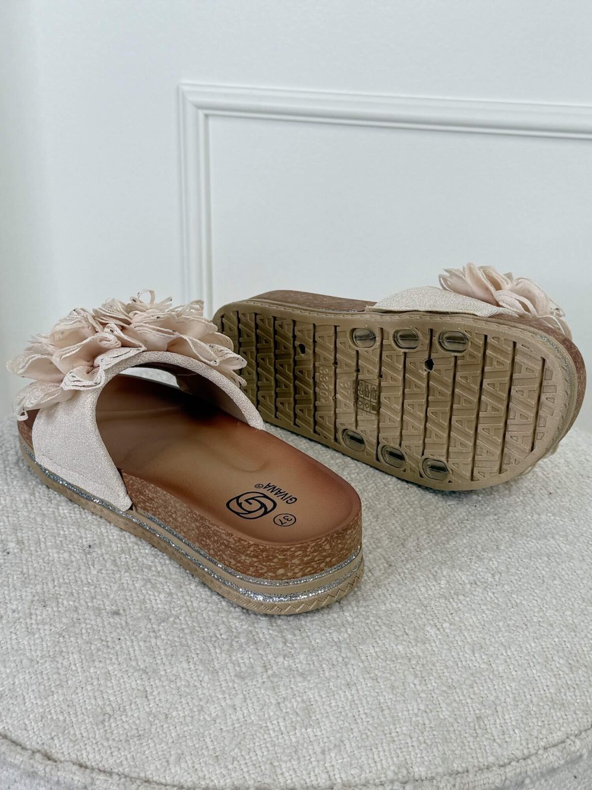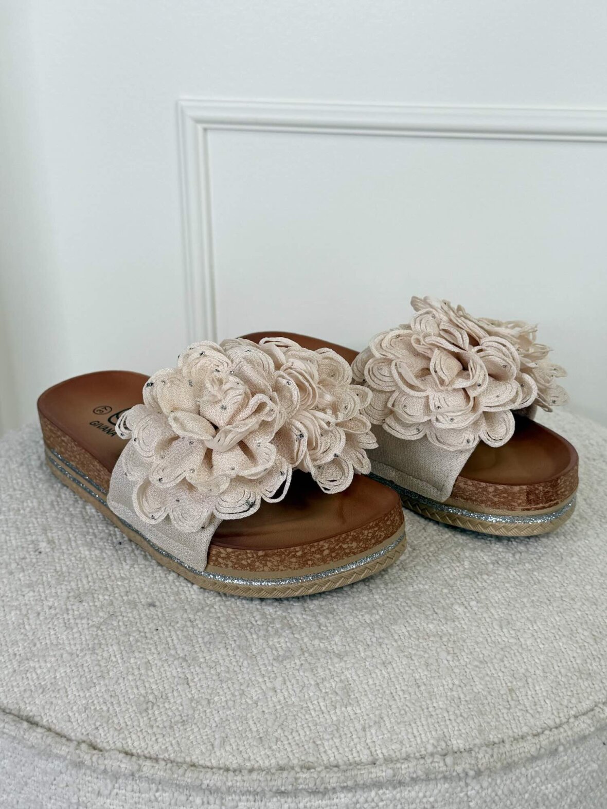 Feminine sandaler i smuk beige nuance med dekorative blomsterdetaljer, der giver et elegant og romantisk udtryk. Den komfortable plateau-sål med fine detaljer skaber både højde og komfort, mens slip-on designet gør dem nemme at tage på. Perfekte til sommerkjoler, ferier og afslappede, stilfulde outfits.
