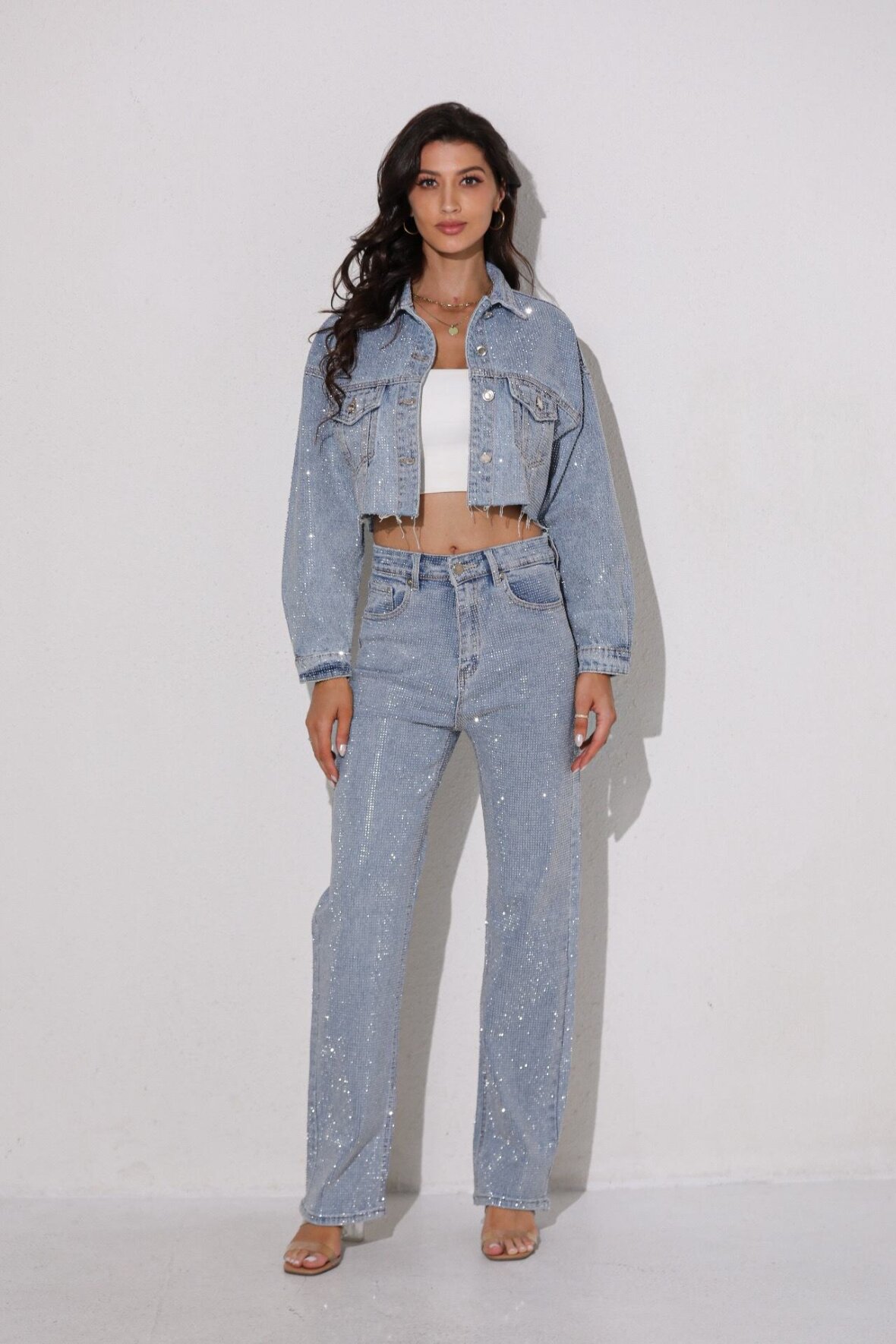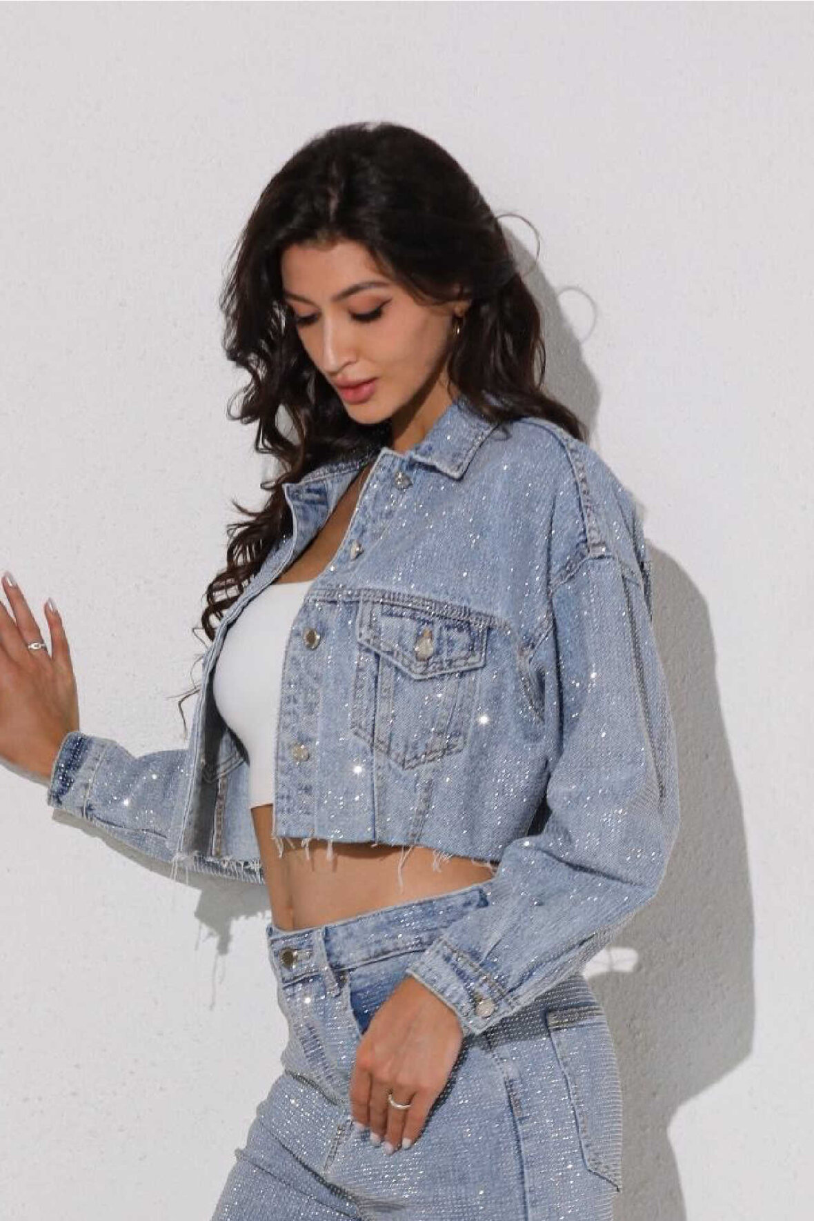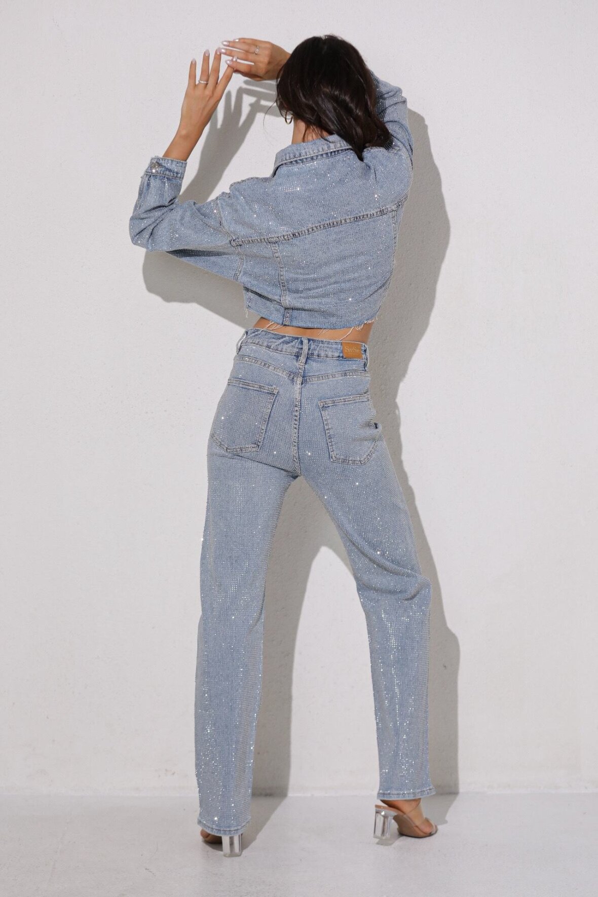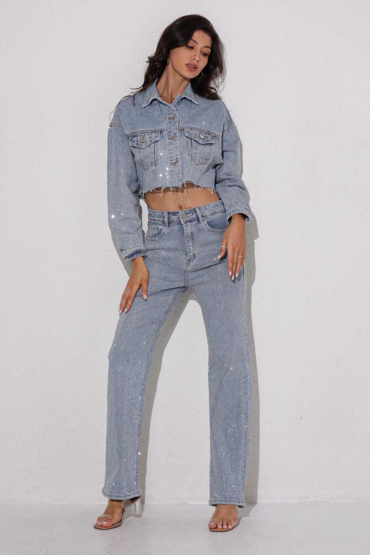 Denimjakke i lys blå vask med smuk glimmer-effekt, der giver et eksklusivt og moderne udtryk. Modellen har klassisk krave, knaplukning og brystlommer. Jakken er designet i en trendy oversize pasform og indeholder stretch, som gør den behagelig at have på og nem at style til både hverdag og fest.