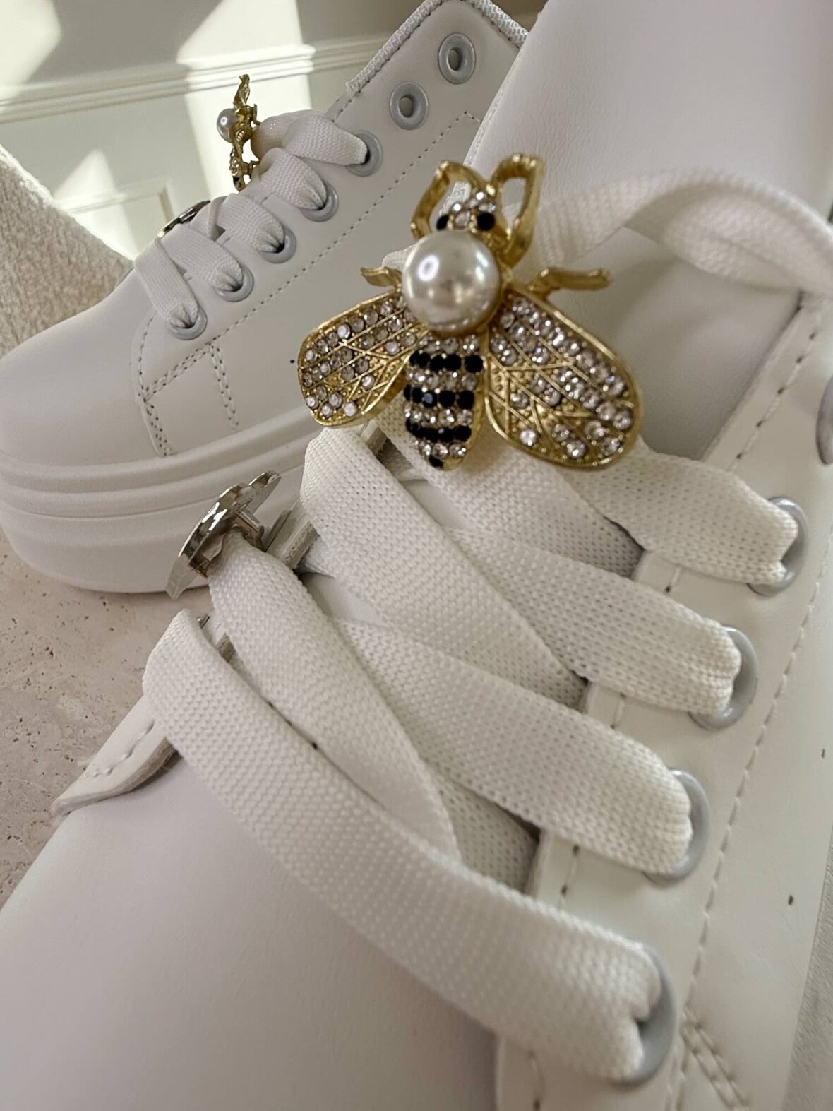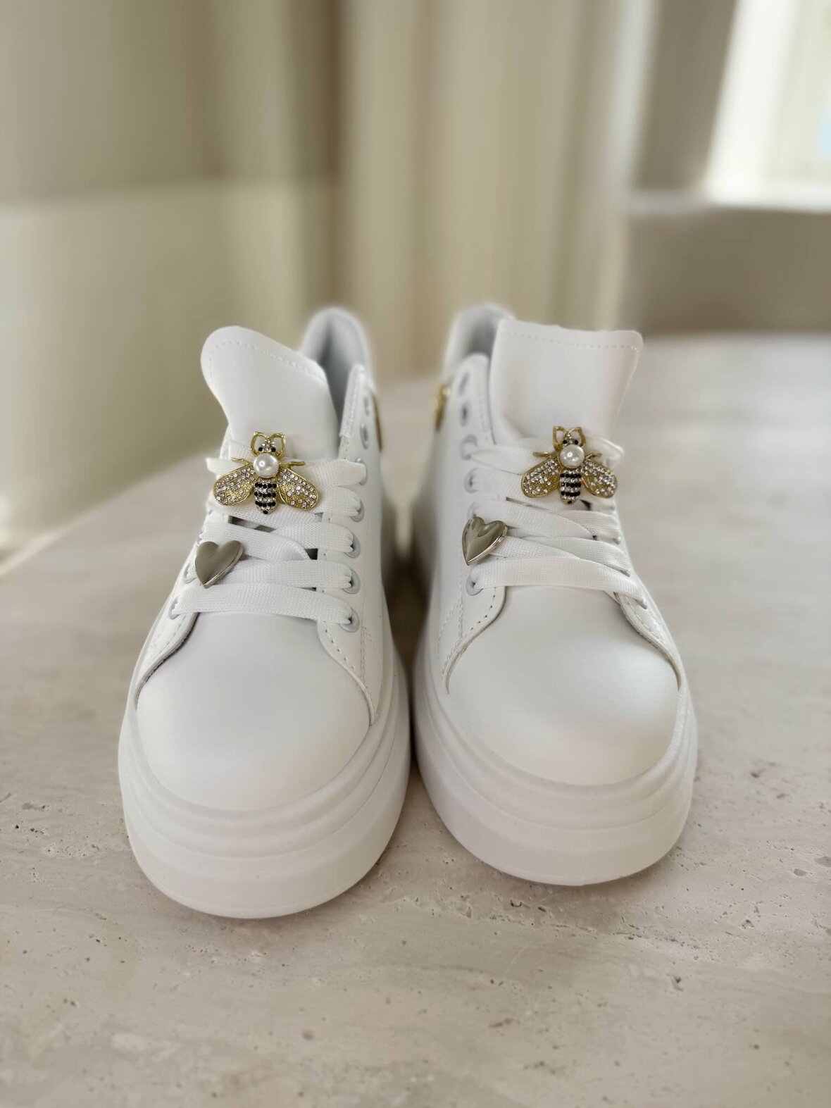 Stilrene sneakers i klassisk hvid med eksklusive gulddetaljer, der tilfører et feminint og unikt touch. De fine charms og glitrende hælkappe giver et elegant twist til det sporty design, mens den komfortable sål sikrer en behagelig pasform til både hverdag og casual chic looks.