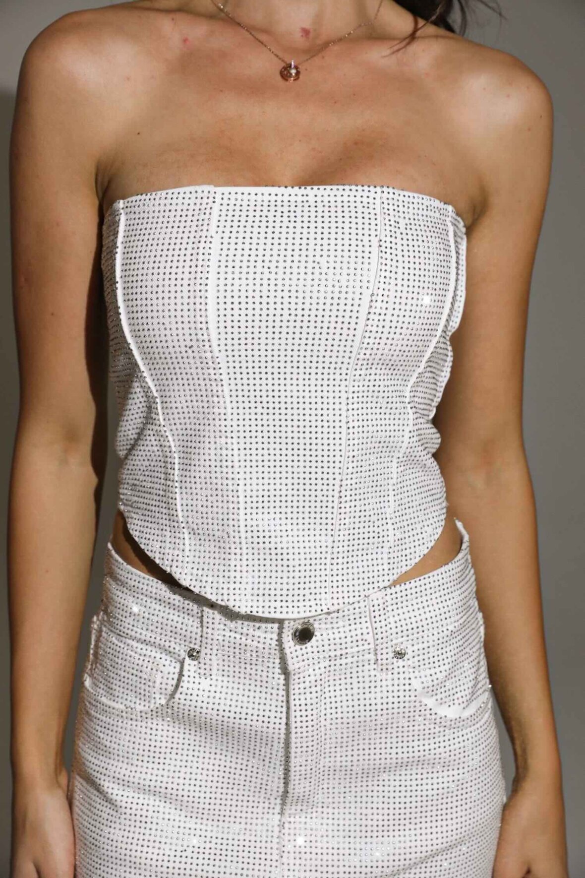 Tube top i elegant hvid denim med smuk glimmer-effekt, der giver et eksklusivt og feminint look. Modellen har en flatterende pasform med lynlåslukning i siden. Toppen indeholder stretch, som sikrer komfort og en smuk silhuet. Perfekt til festlige outfits eller til et stilfuldt sæt med matchende denim.