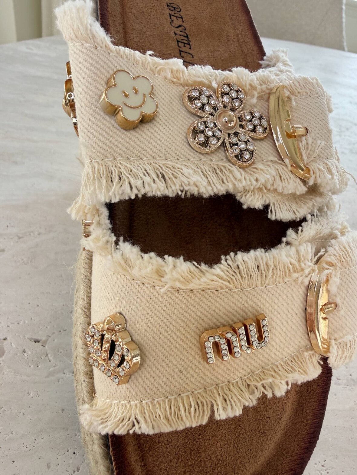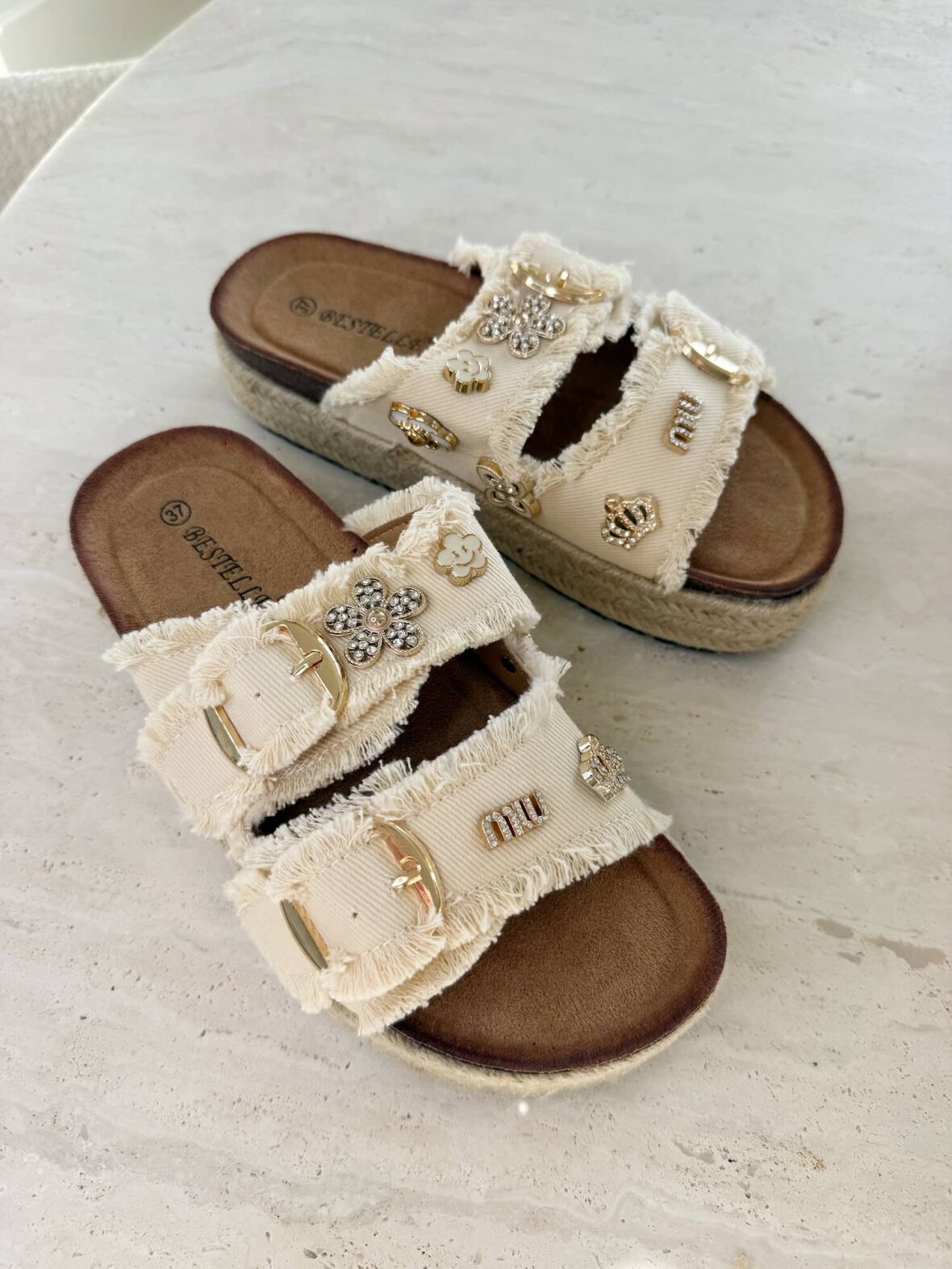 Trendy sandaler i lys creme med rå frynsekant og smukke guldfarvede detaljer, der giver et eksklusivt og moderne udtryk. De justerbare spænder sikrer god pasform, mens den bløde sål giver høj komfort hele dagen. Perfekte til både hverdag og ferielooks med et feminint twist.