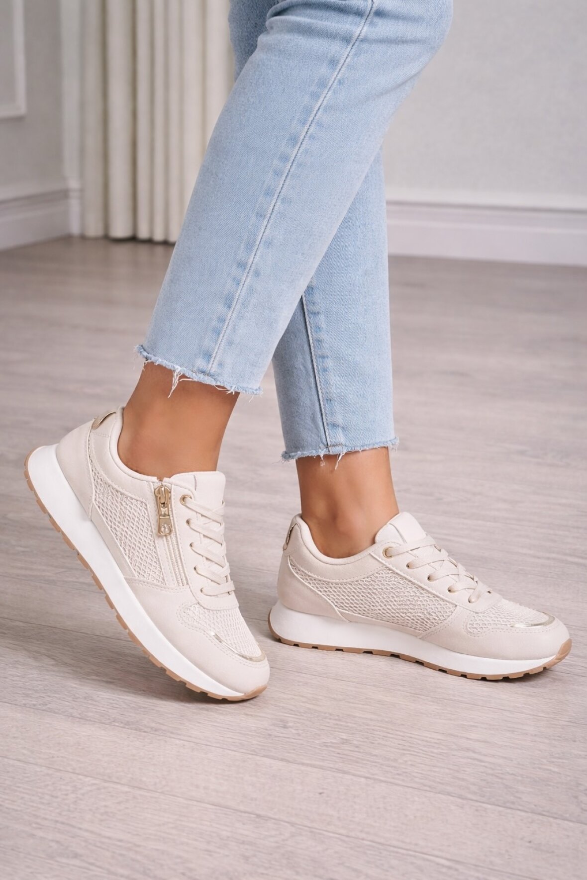 Sporty sneakers i en lys beige nuance med moderne detaljer og praktisk lynlås i siden. Det lette mesh-materiale giver et luftigt og komfortabelt fit, mens den stabile sål sikrer god støtte. Perfekte til både aktive dage og afslappede hverdagslooks.