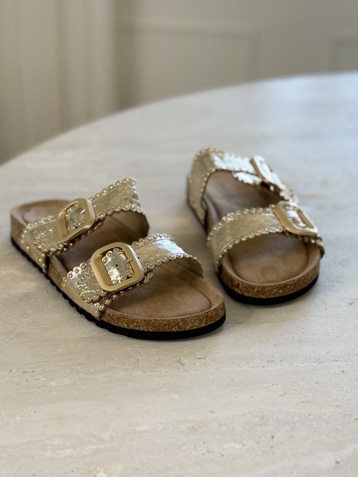 Smukke sandaler i en elegant gylden nuance med fine, feminine detaljer. De dobbelte remme er dekoreret med diskrete perler og gyldne spænder, som tilfører et eksklusivt og sommerligt udtryk.