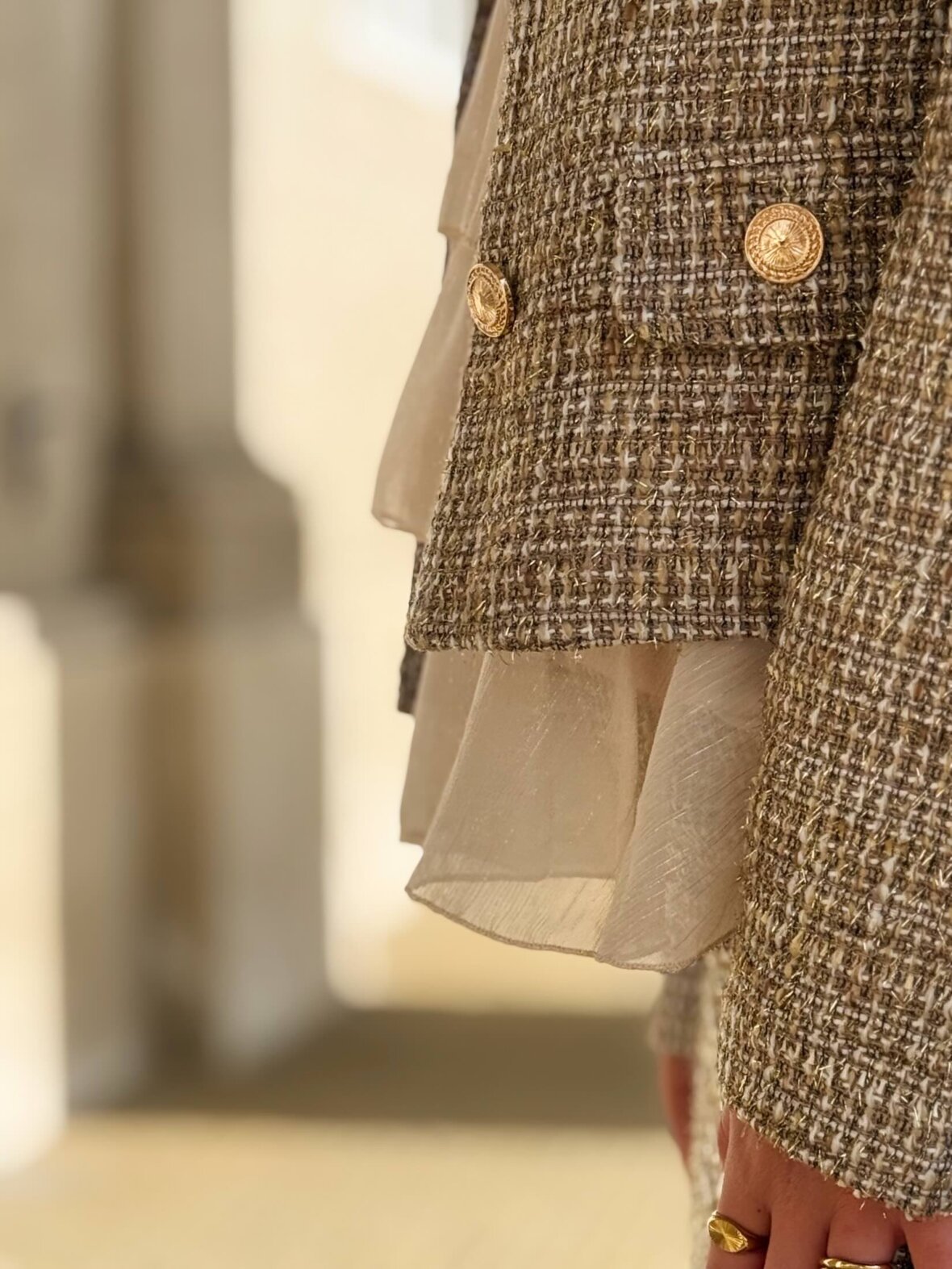 Elegant og klassisk tweedjakke i smuk gylden nuance med eksklusiv struktur. Designet med dekorative guldknapper, rund halsudskæring og korte længde, der giver et sofistikeret og feminint udtryk.