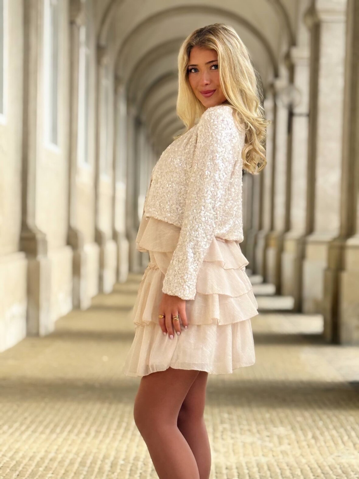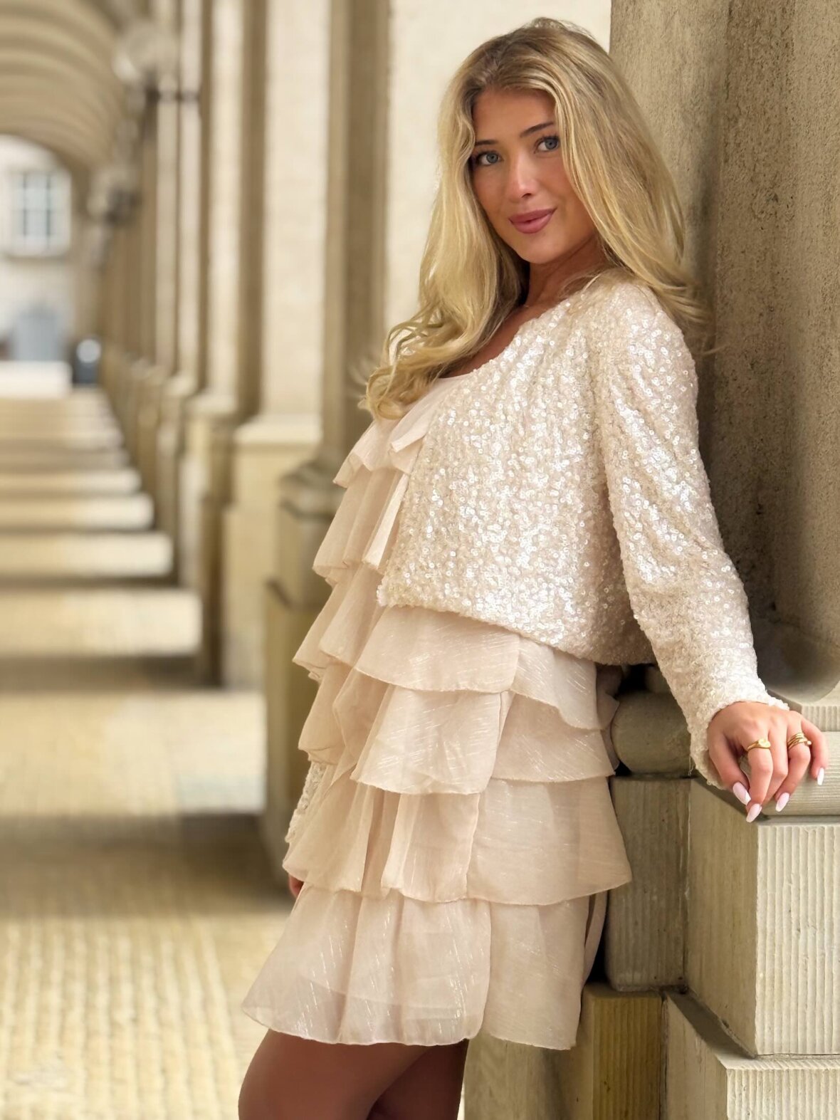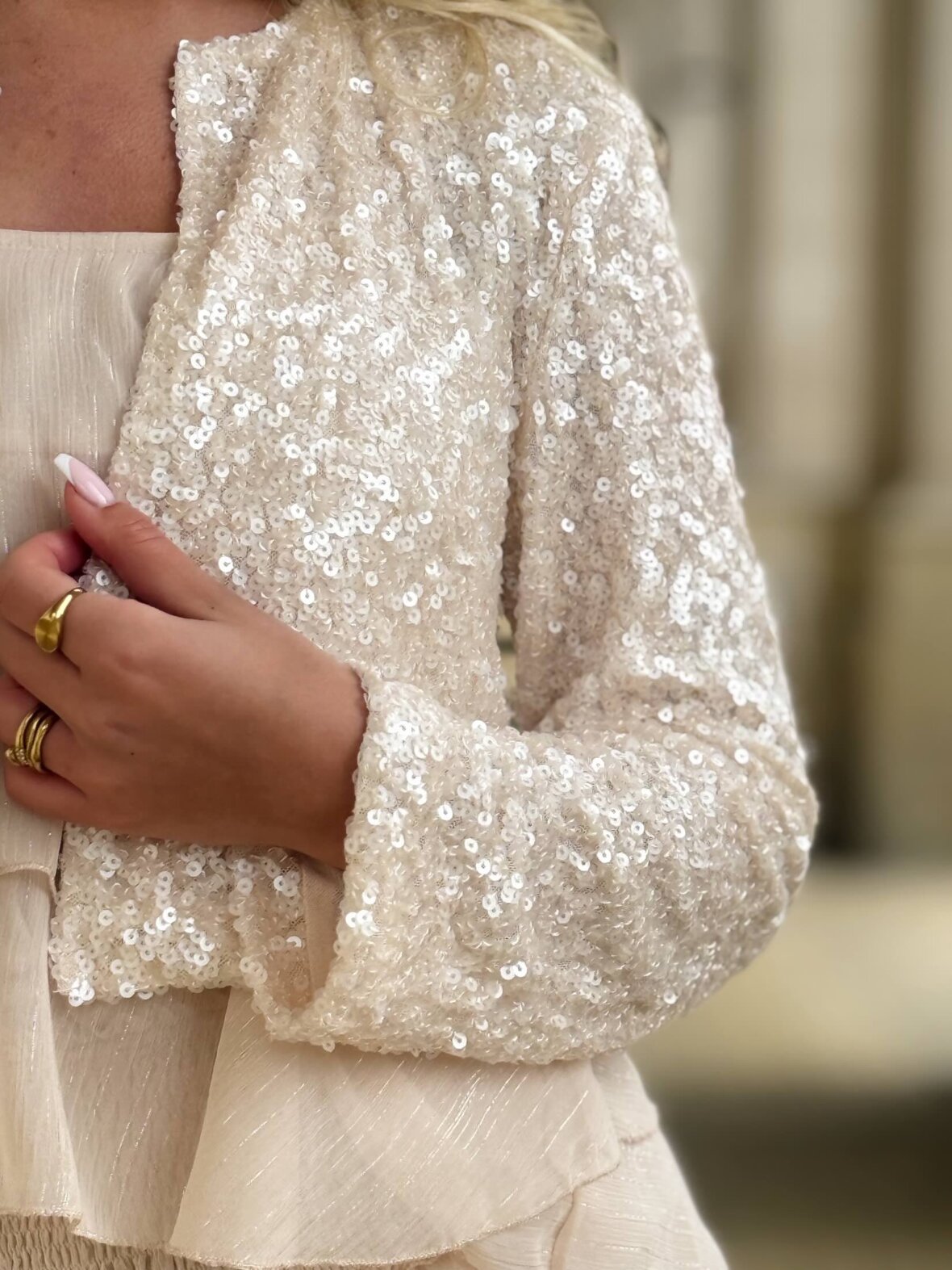 Eksklusiv og iøjnefaldende top dækket af fine pailletter i en smuk champagne nuance. Designet med rund hals, lange ærmer og en kort, feminin pasform, der skaber et elegant og festligt udtryk.