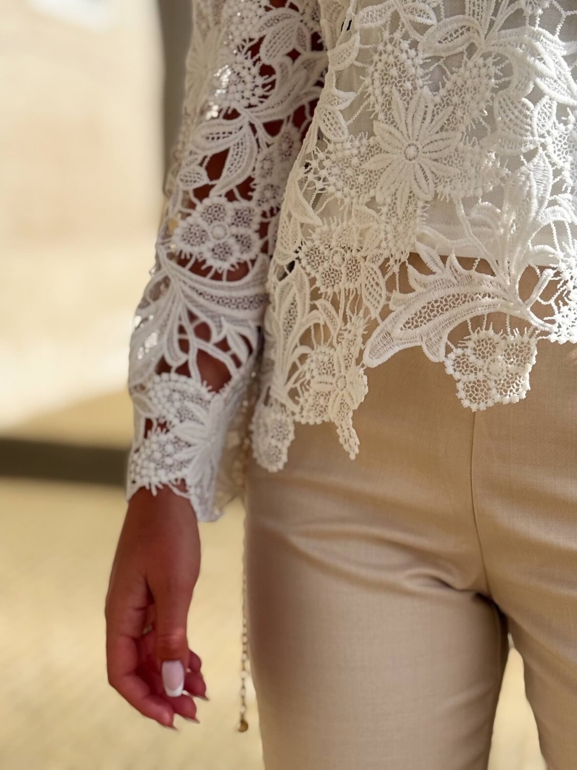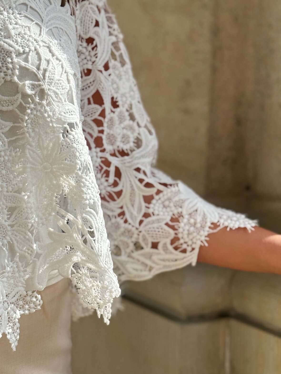 Smuk og feminin blondetop med fine, detaljerede mønstre og et elegant, let transparent udtryk. Toppen har en løs pasform og dekorativ kant, der giver et romantisk og eksklusivt look.