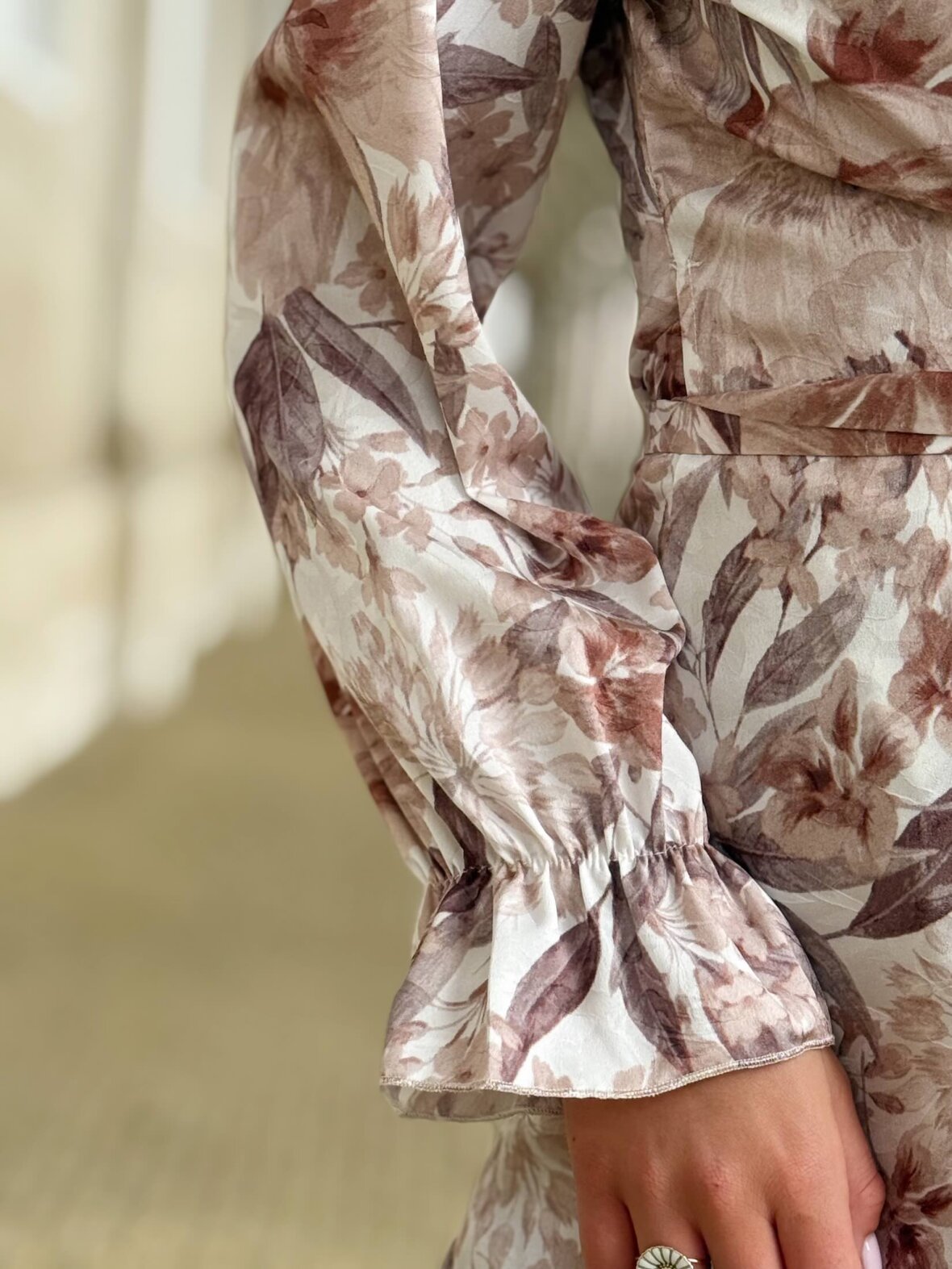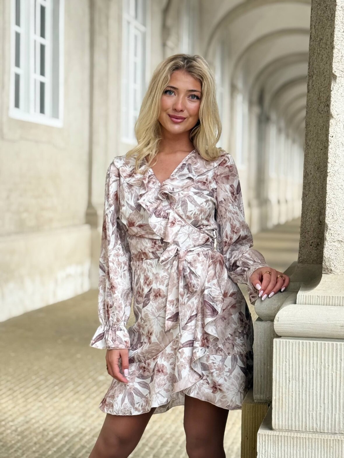 Feminin og elegant kjole med smukt blomsterprint i bløde rosa nuancer. Designet med fine flæsedetaljer, v-udskæring og bindebånd i taljen, der skaber en flatterende og romantisk silhuet.