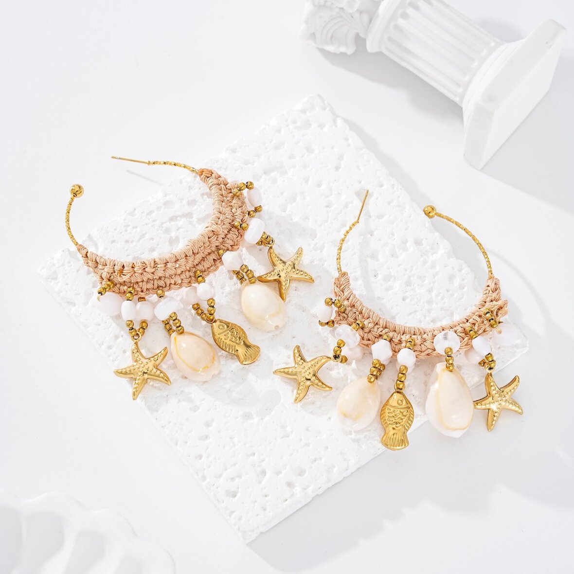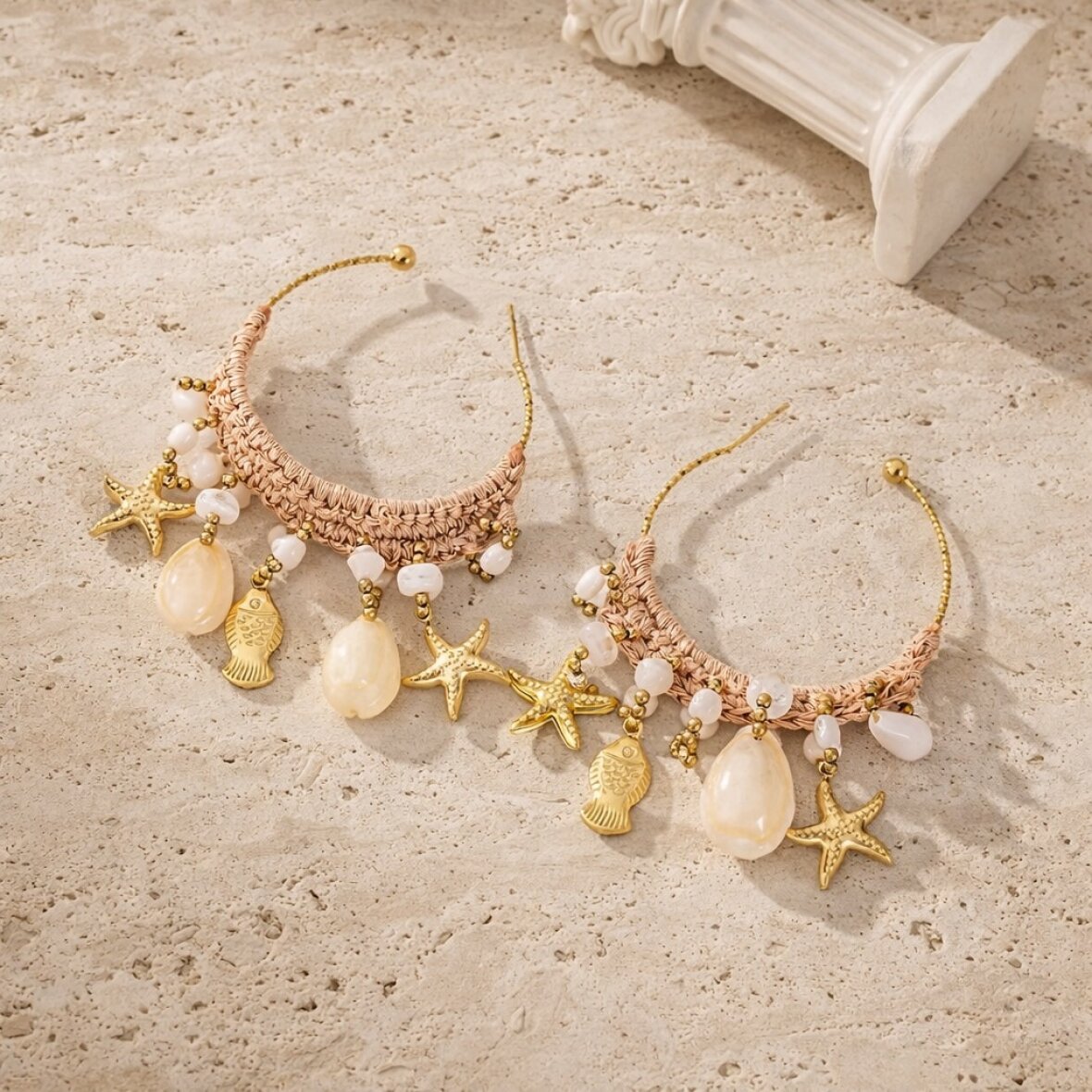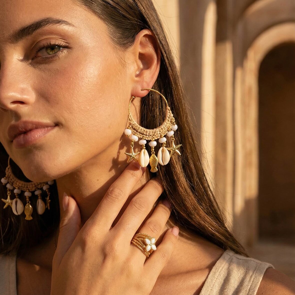 Smukke hoops med fine detaljer i perler, muslinger og små vedhæng, der giver et eksklusivt og sommerligt udtryk. Det lette design gør dem behagelige at bære hele dagen, mens de gyldne nuancer tilfører varme og elegance til ethvert outfit.