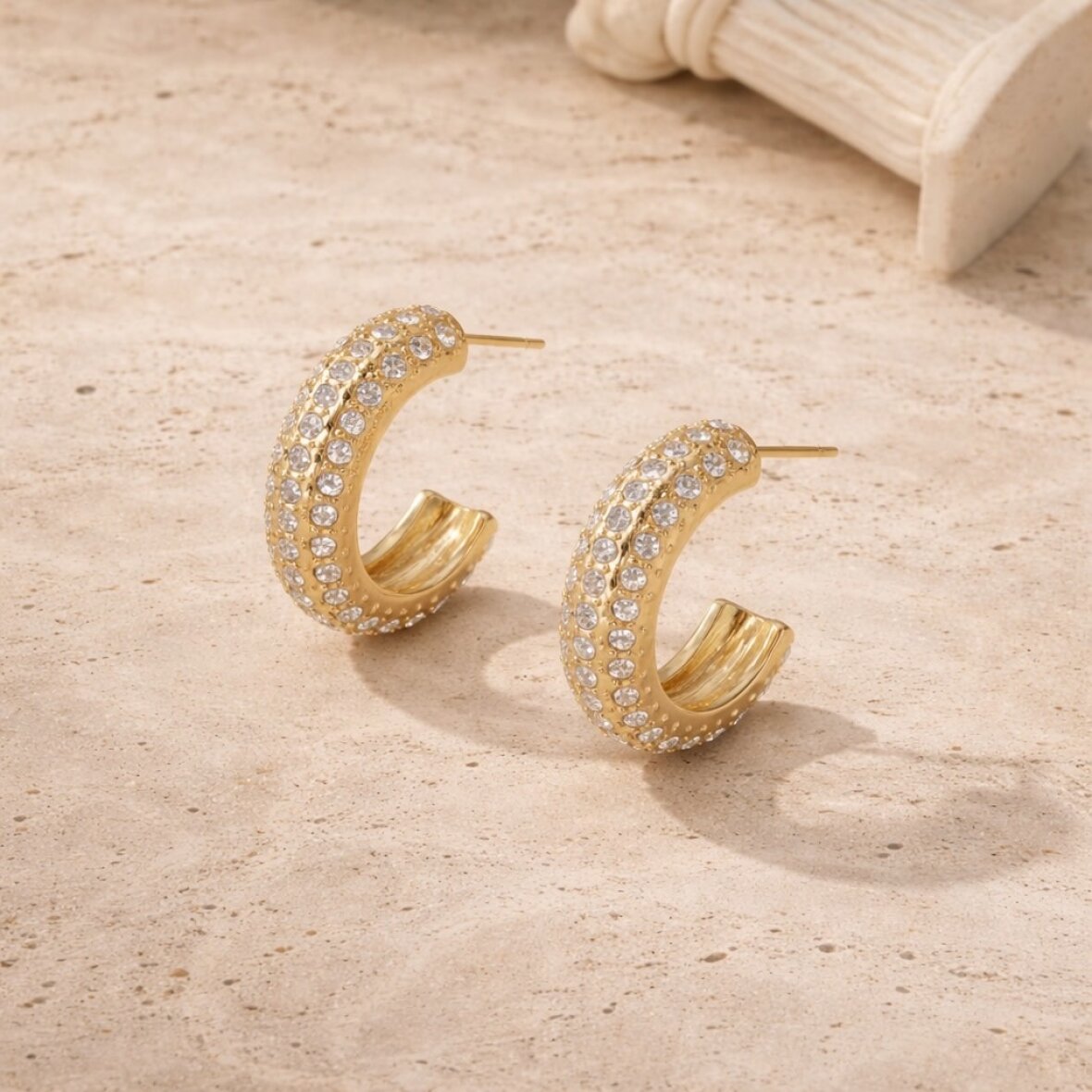 Eksklusive hoops i et fyldigt design med smukke, funklende sten, der giver et luksuriøst og iøjnefaldende udtryk. De afrundede former skaber et elegant look, mens de fine detaljer tilfører ekstra glans. Perfekte til både festlige anledninger og til at opgradere hverdagsstilen.