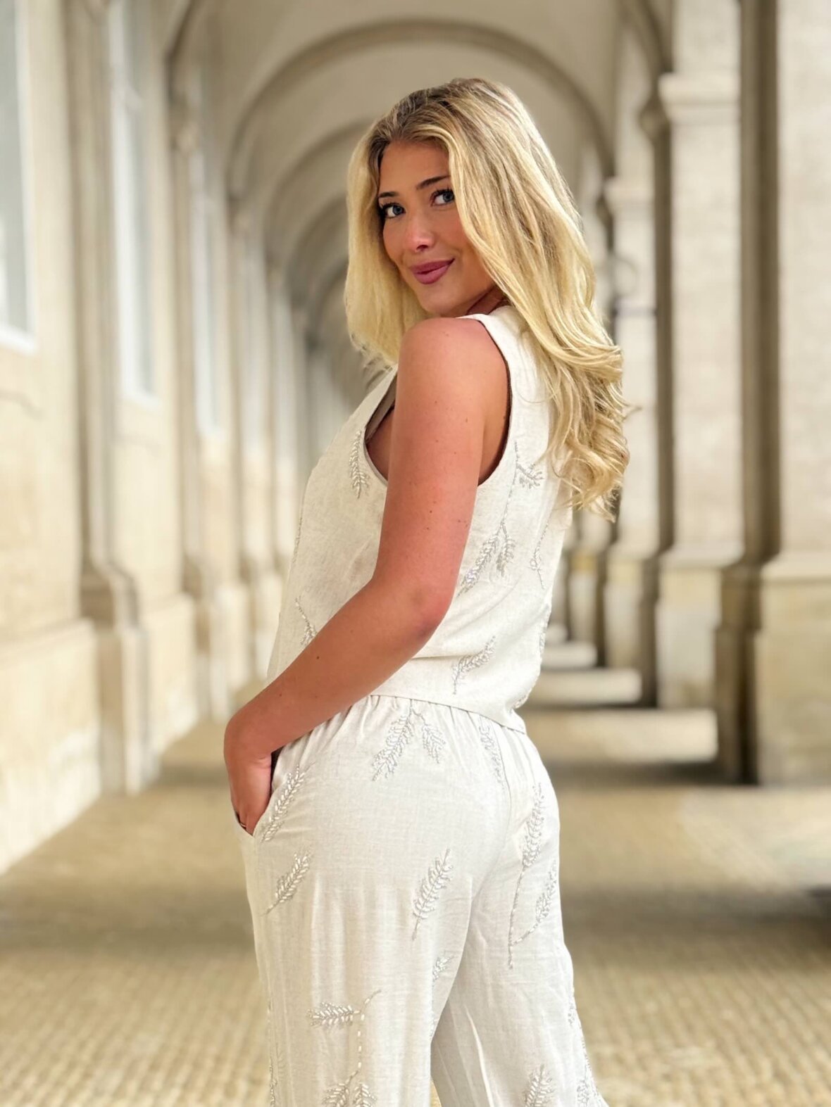 Vesten har et enkelt, feminint snit, mens bukserne har en behagelig pasform, der falder let og elegant. De delikate broderier tilføjer et eksklusivt touch og gør sættet perfekt til både sommerdage, ferie og stilfulde hverdagslooks.