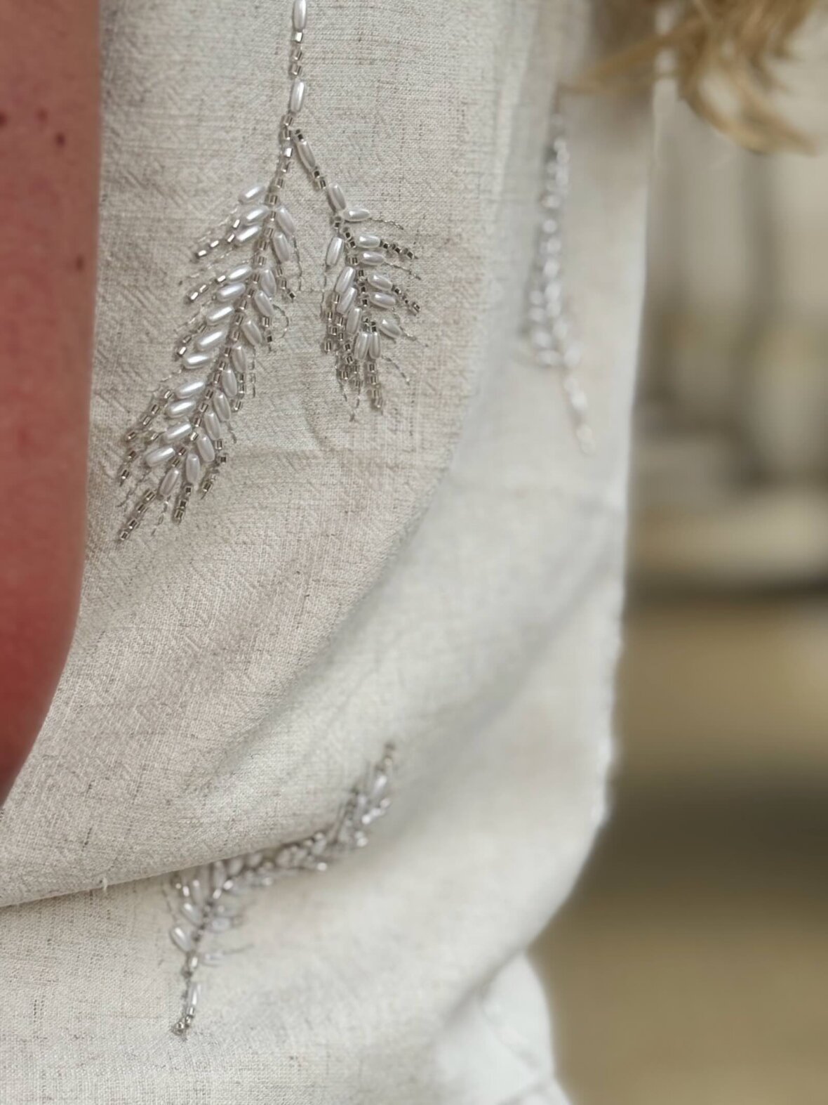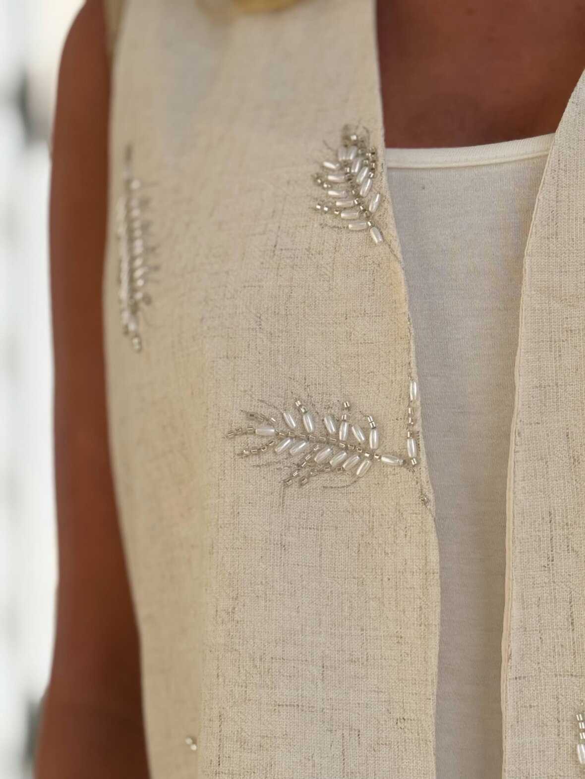 Elegant og afslappet sæt i let kvalitet med fine broderede detaljer. Består af vest og bukser i en smuk sandfarvet nuance, der giver et naturligt og sofistikeret udtryk.