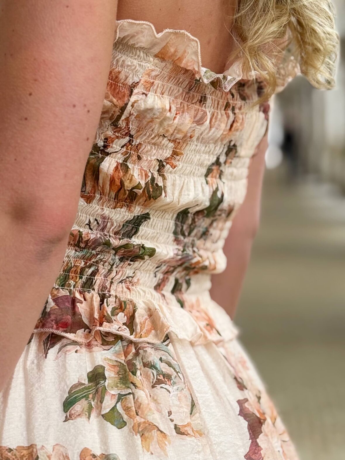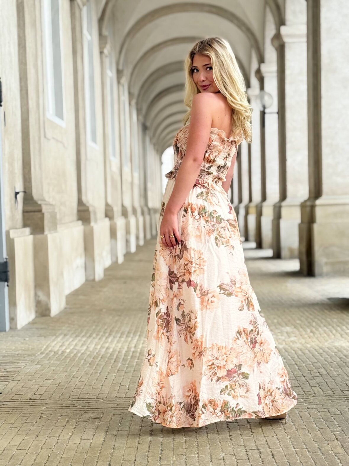 Romantisk og feminin maxikjole med smukt blomsterprint i bløde rosa nuancer. Designet med smock over brystet, der giver en flatterende pasform og høj komfort, samt en let og luftig silhuet, der falder elegant.