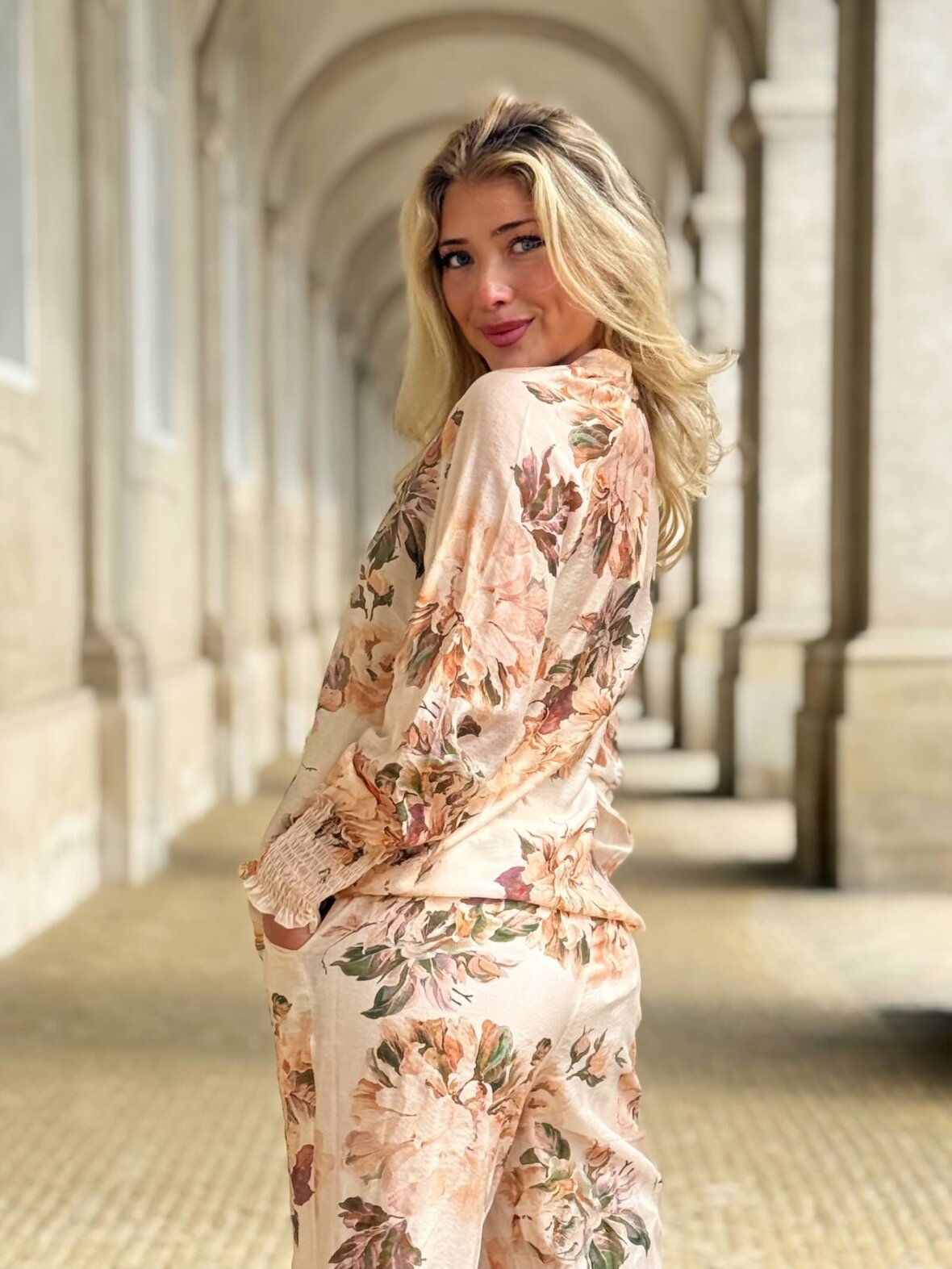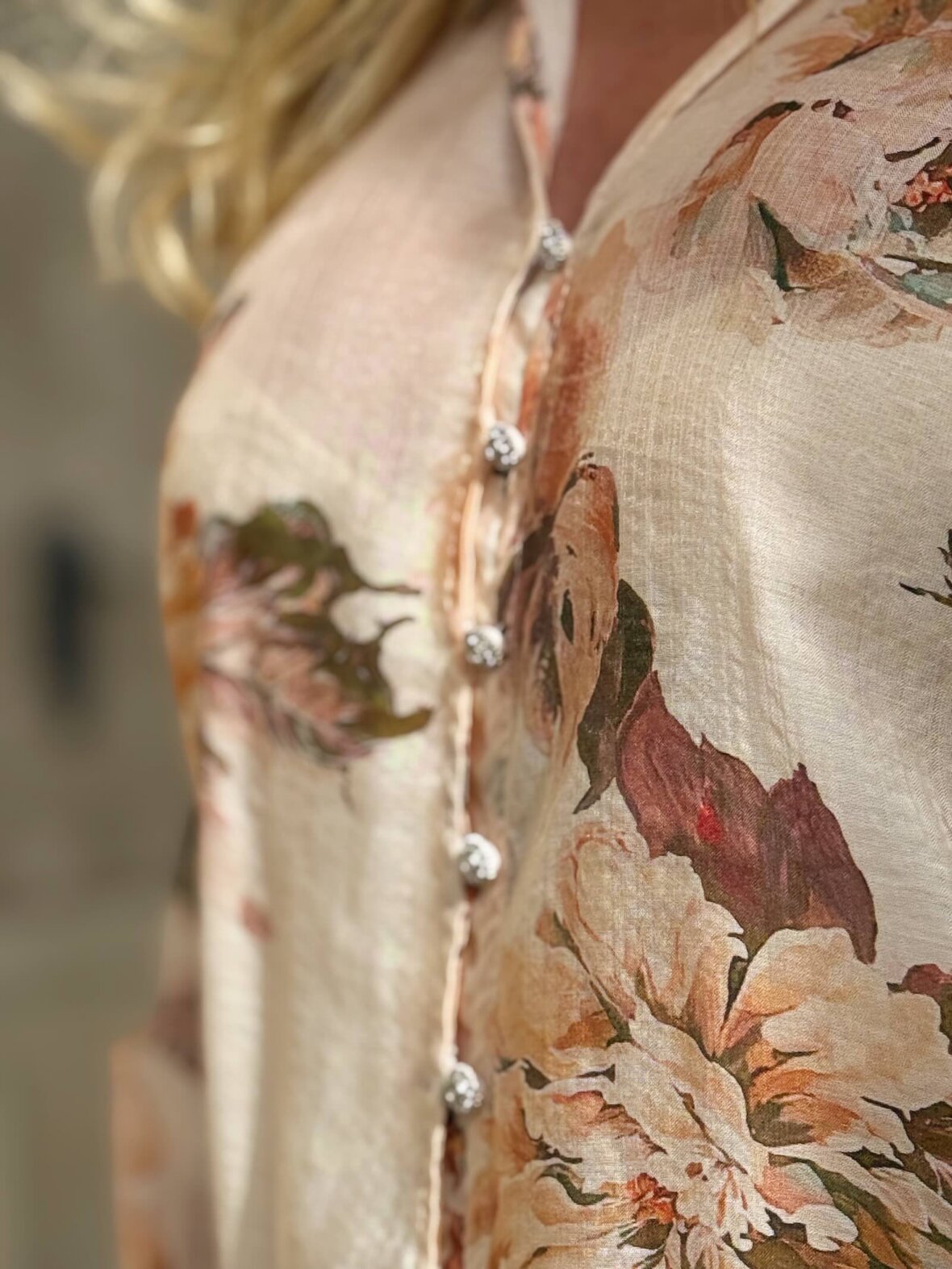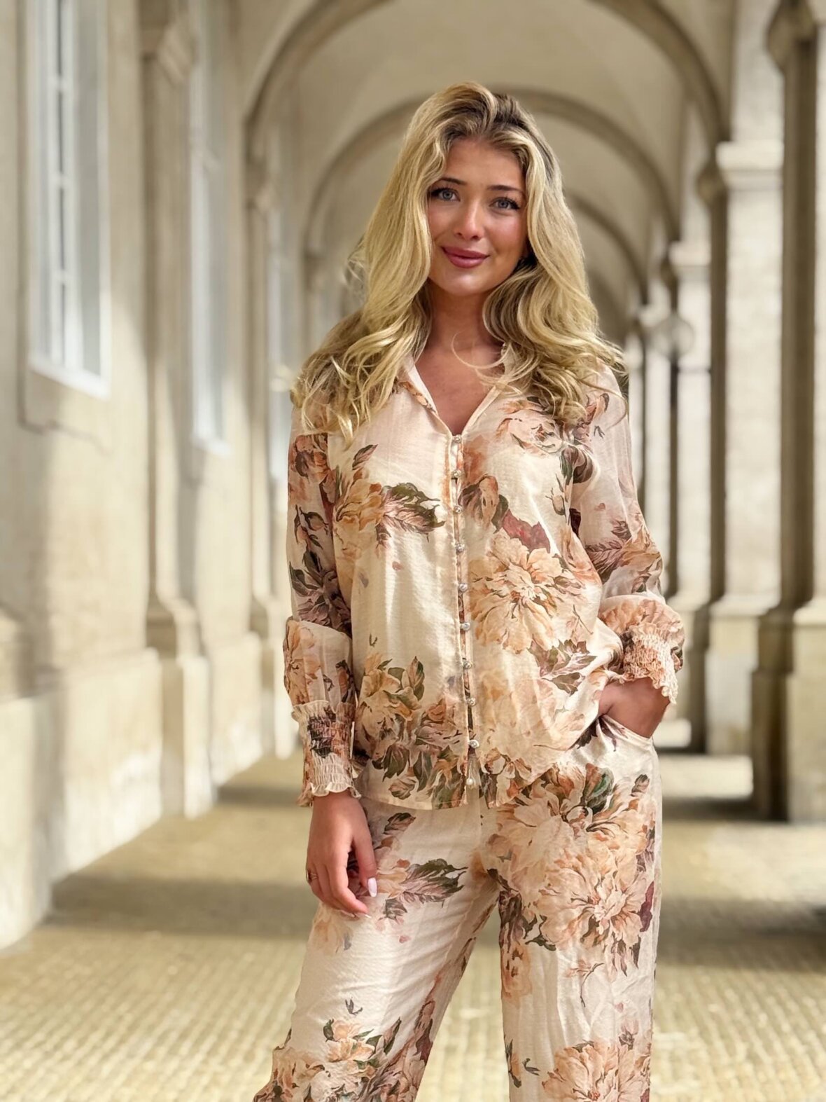 Elegant skjorte i et smukt blomsterprint i varme rosa og beige nuancer. Designet med fine knapper foran og feminine smock-detaljer ved ærmerne, der giver et let og sofistikeret udtryk.