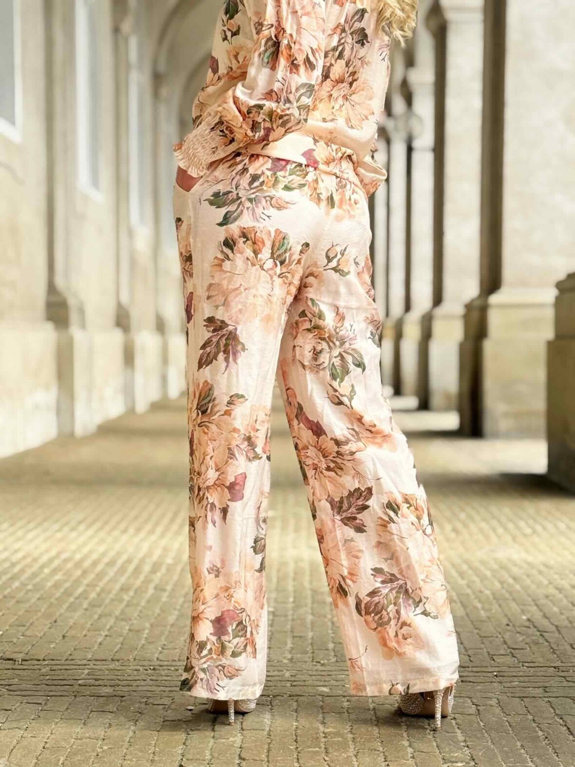 Let og elegant buks i smukt blomsterprint i bløde rosa og beige nuancer. Designet med elastik i taljen og bindebånd, som giver en behagelig pasform og et afslappet, men stilfuldt udtryk.