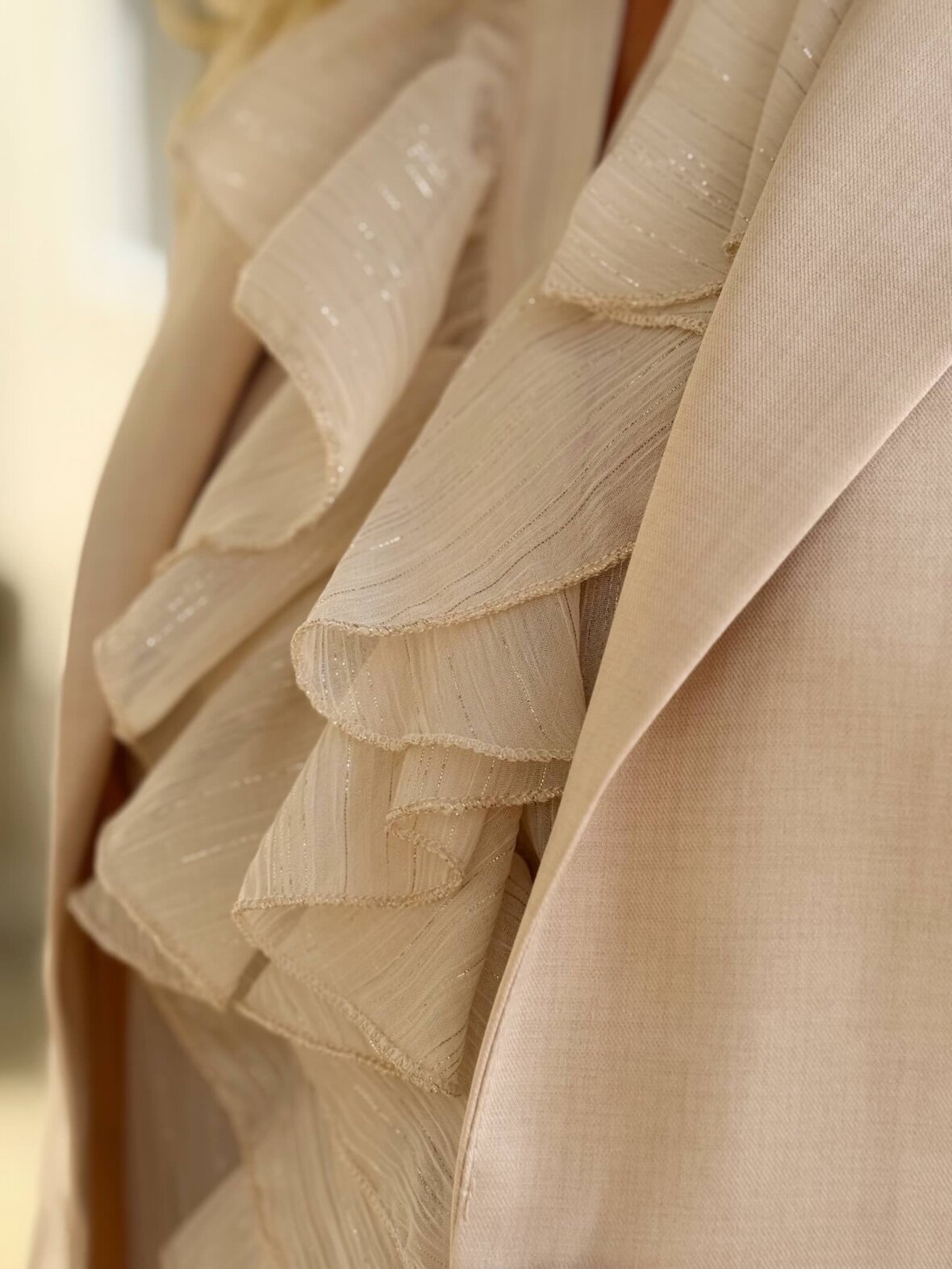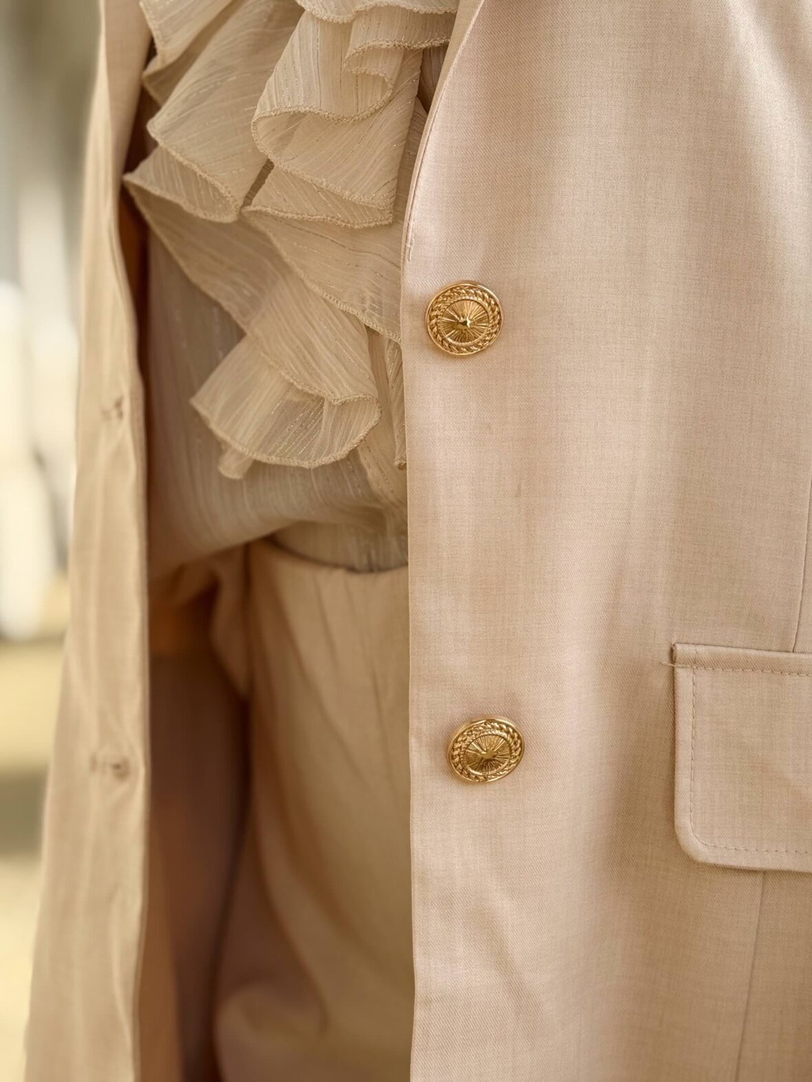 Tidløs og elegant blazer i en smuk sandfarvet nuance. Designet med klassisk revers, knaplukning og en flatterende pasform, der giver et stilrent og sofistikeret udtryk.