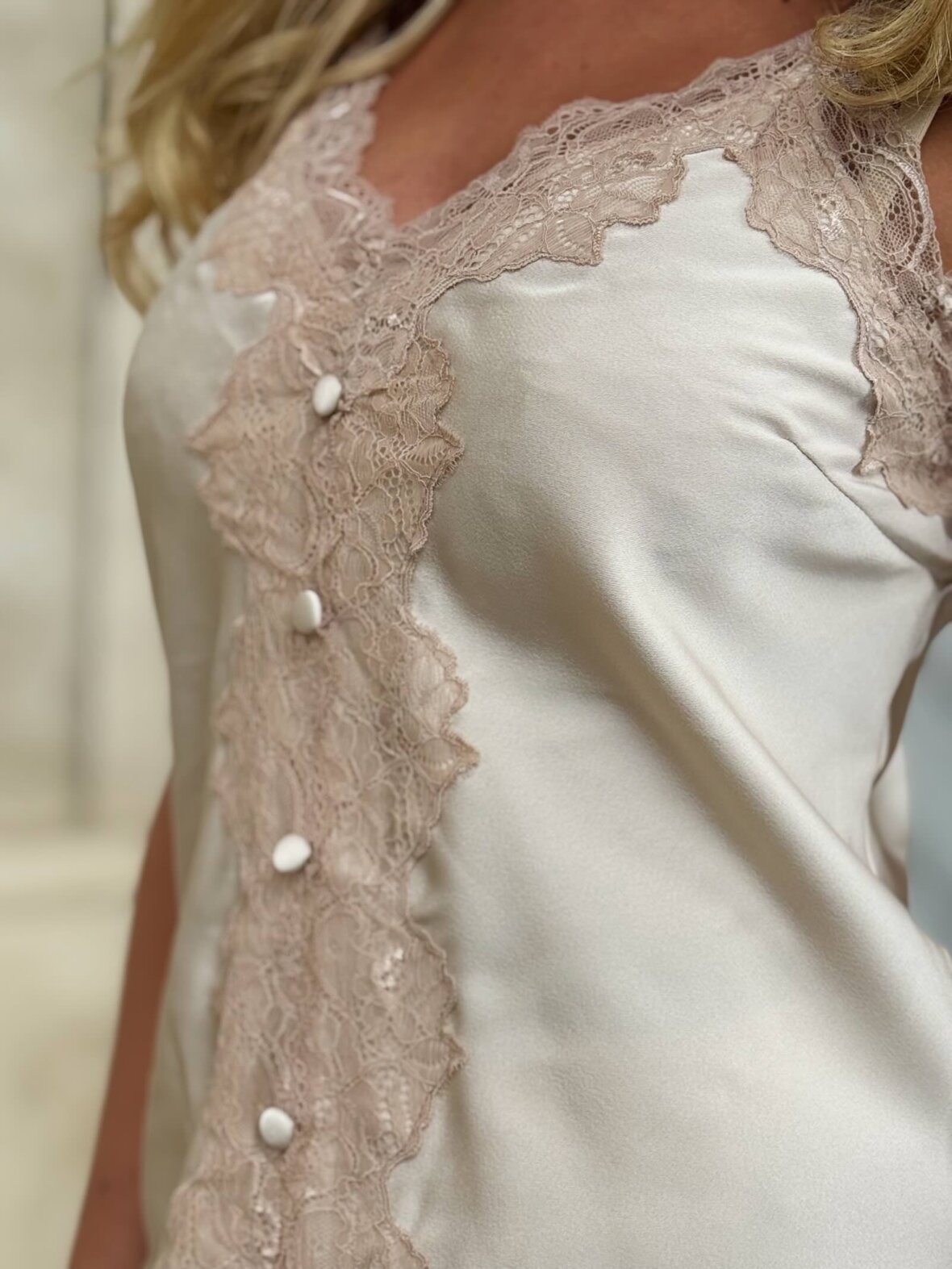 Feminin top i en smuk beige nuance med fine blonde-detaljer, der giver et elegant og romantisk udtryk. Designet med tynde stropper, dekorative knapper og en flatterende pasform, der falder let og blødt.