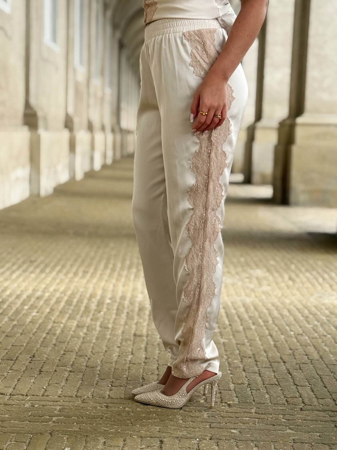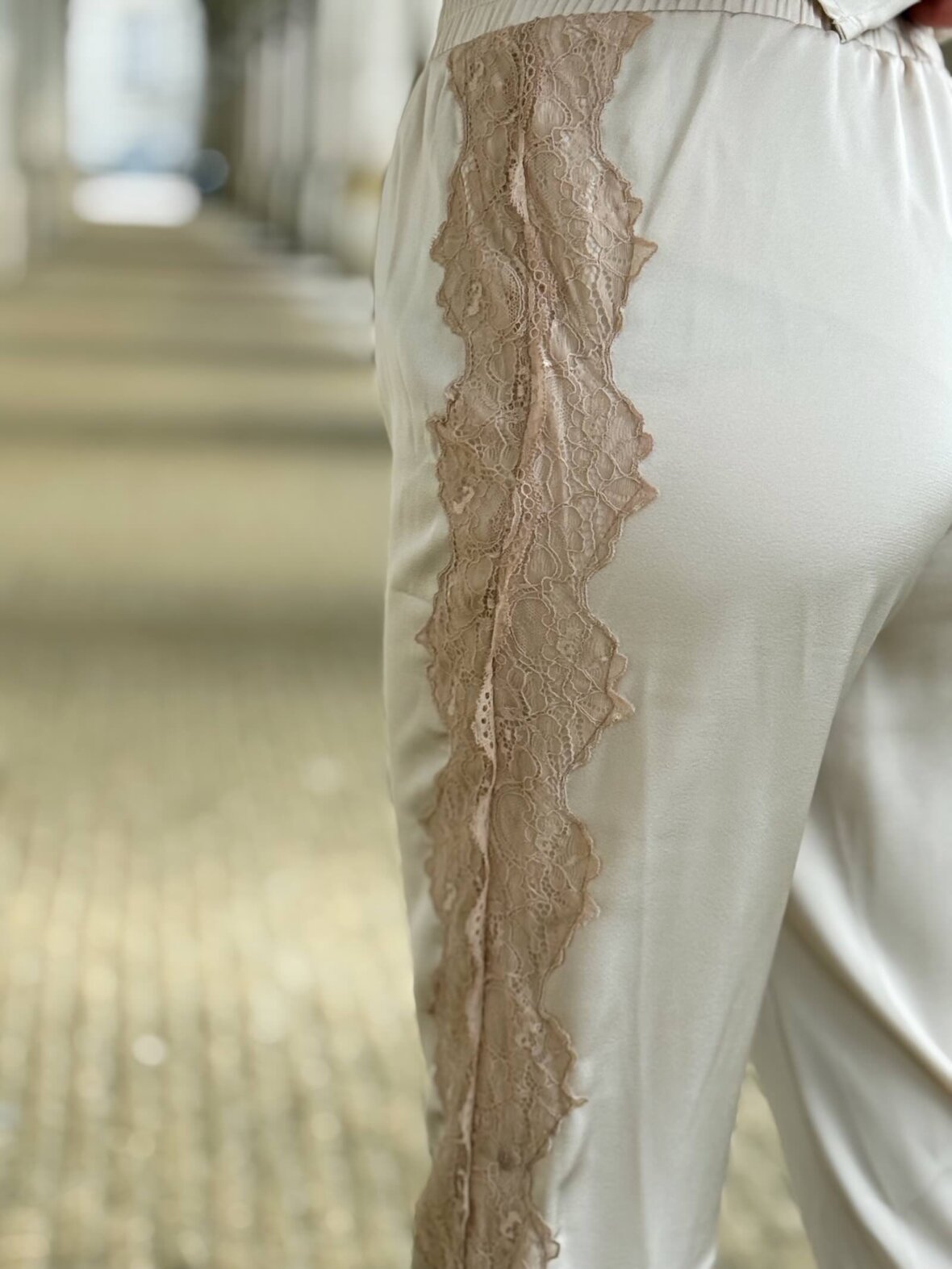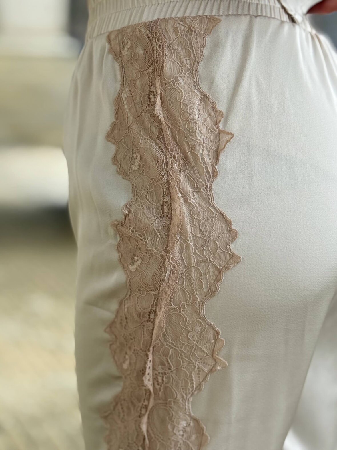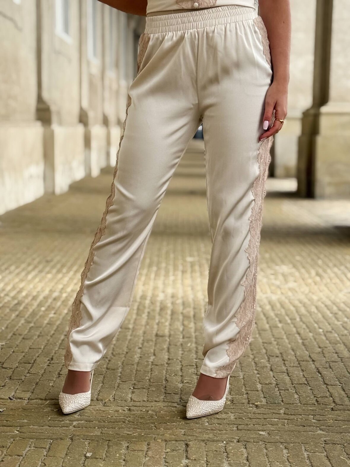 Elegante bukser i en smuk champagnefarvet satin med fine blondedetaljer langs siderne, der tilfører et feminint og eksklusivt udtryk. Den let skinnende kvalitet giver et sofistikeret look med en luksuriøs finish.