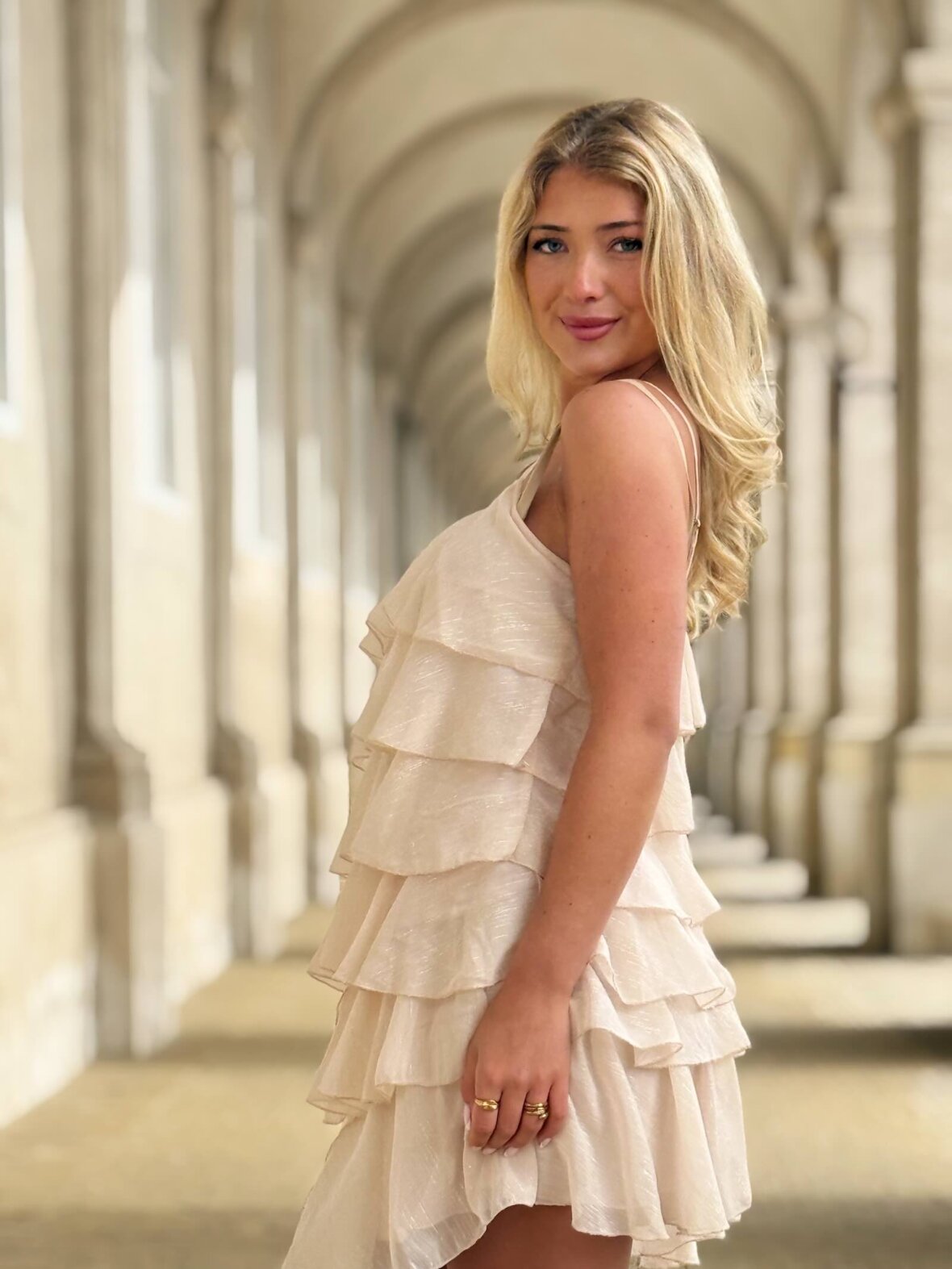 Feminin top i en smuk sandfarvet nuance med elegante lag-på-lag flæser, der skaber et let og bevægeligt udtryk. Designet med tynde justerbare stropper og en løs pasform, som giver både komfort og et sofistikeret look.