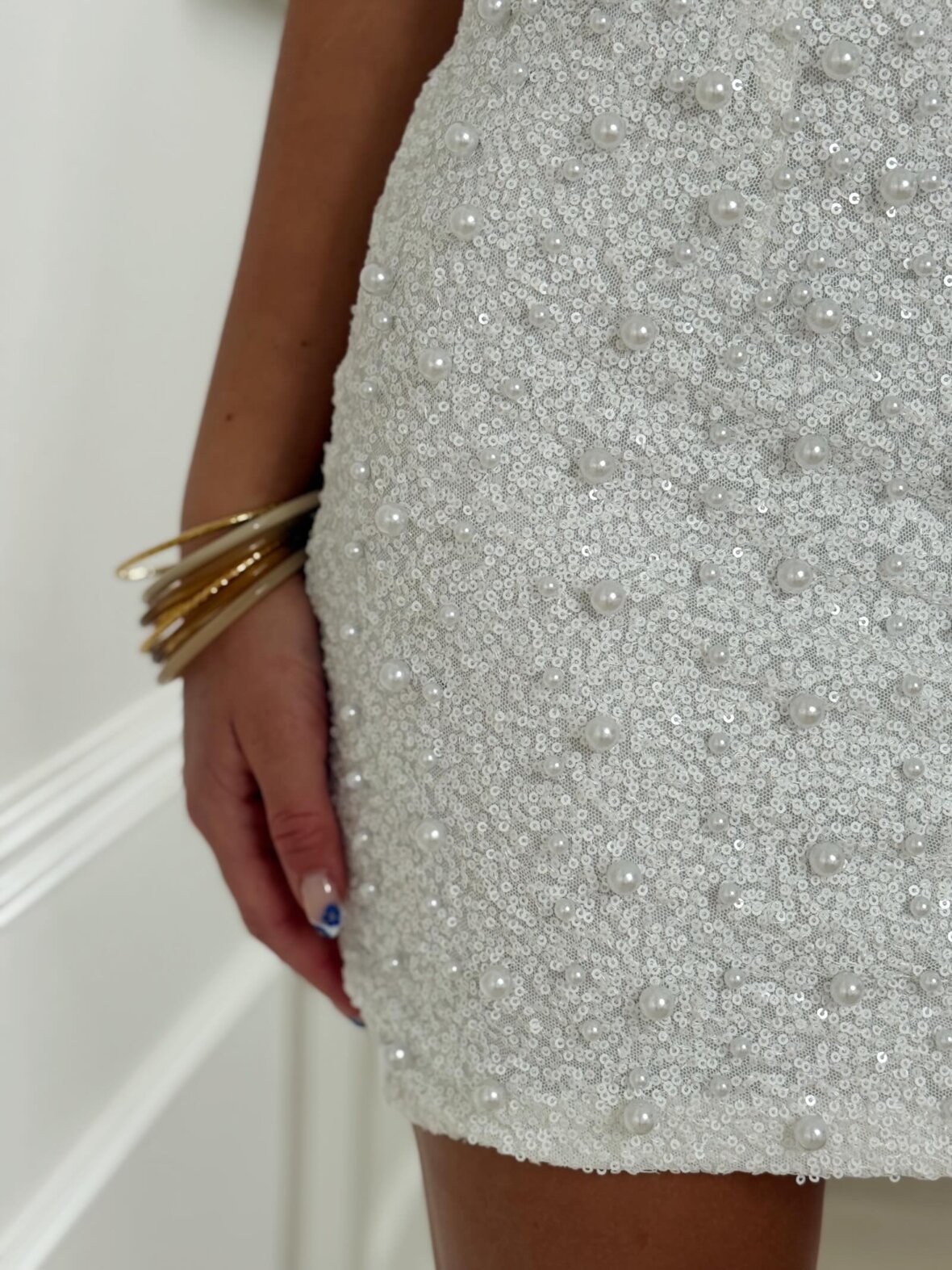 Eksklusiv hvid kjole dækket af smukke perler og fine detaljer, der giver et elegant og luksuriøst udtryk. Designet har en feminin V-udskæring og en tætsiddende pasform, som fremhæver silhuetten. Perfekt til festlige anledninger, bryllup eller en særlig aften, hvor du ønsker et sofistikeret og iøjnefaldende look.
