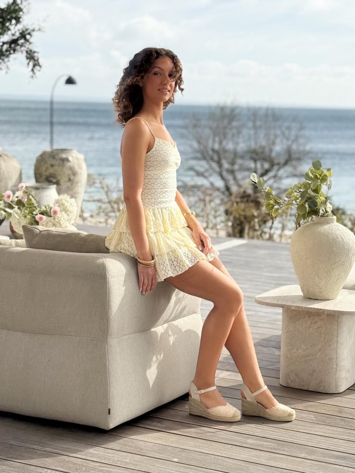 Elegant kort blondekjole i creme med fine stropper og feminine flæsedetaljer. Kjolen har en smuk pasform, der fremhæver figuren og giver et let og romantisk udtryk. Perfekt til sommerfester, ferier og særlige anledninger. Style den med sandaler eller heels for et eksklusivt look.