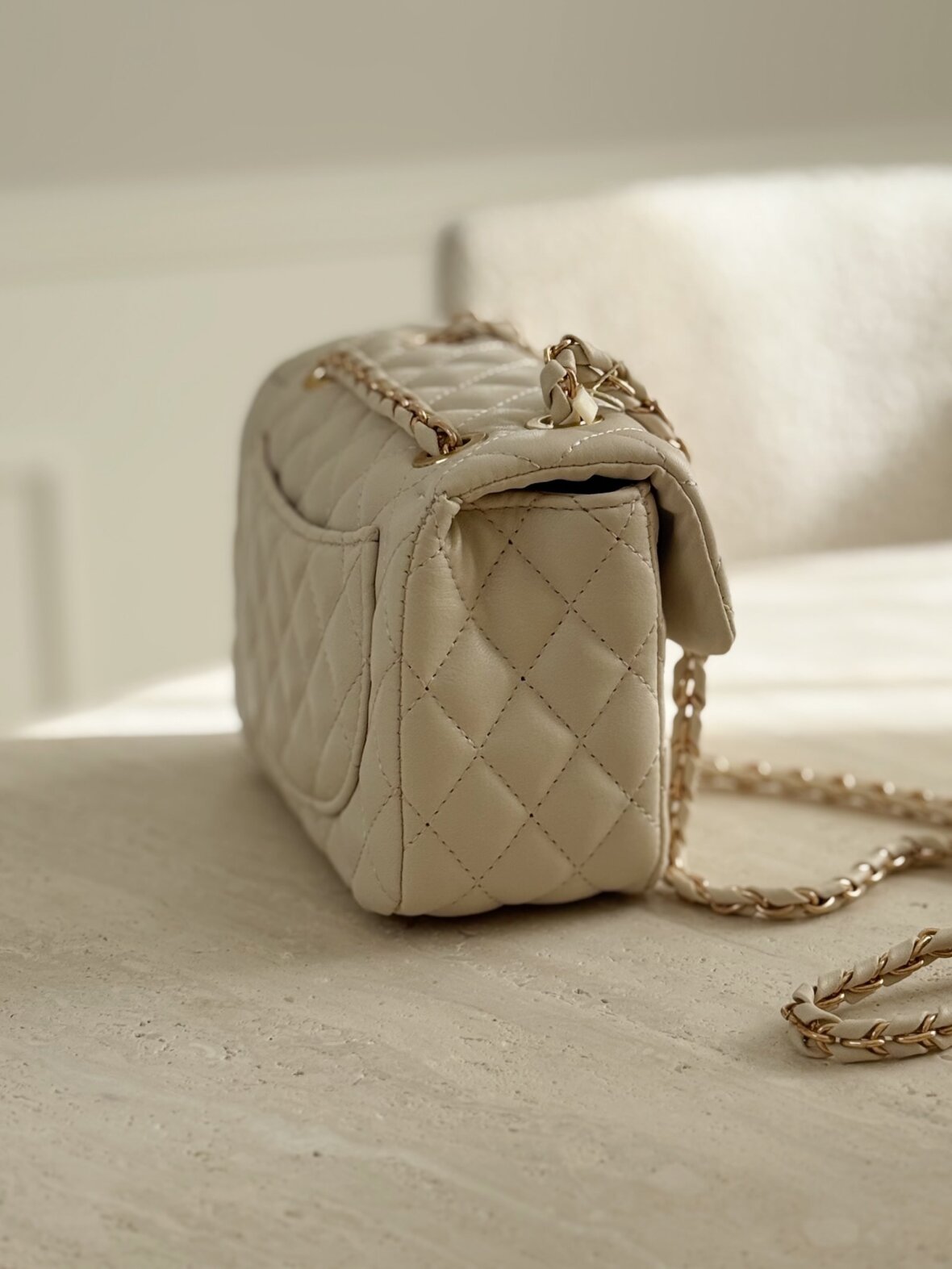 Elegant lille crossbody taske i smuk beige med klassisk quiltet design og guldfarvede detaljer. Den fine kæderem giver et eksklusivt look, mens den kompakte størrelse gør den perfekt til både hverdag og fest. Tasken lukkes sikkert og har plads til dine vigtigste essentials som mobil, kort og småting – en tidløs favorit, der fuldender ethvert outfit.
