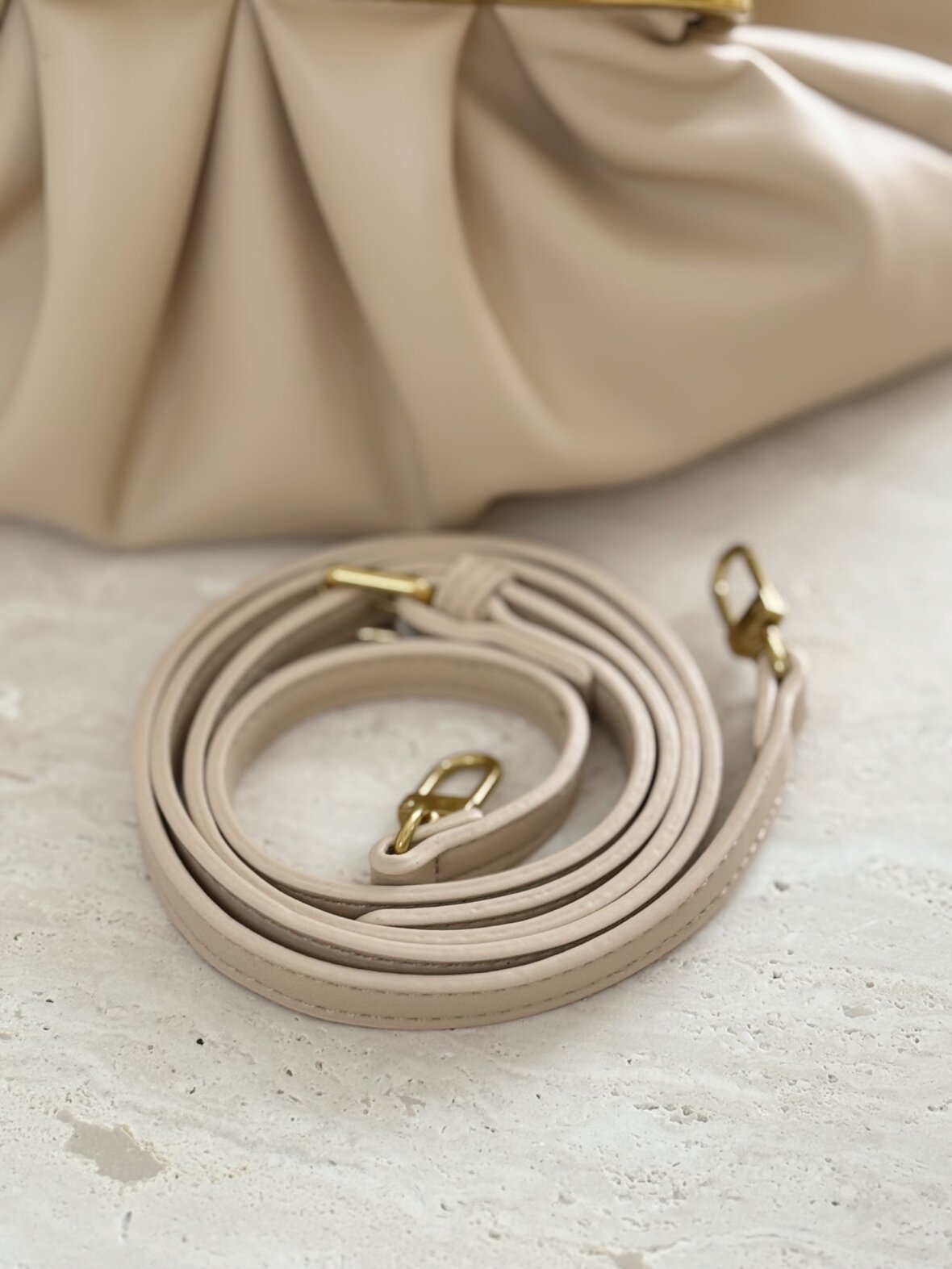 Elegant clutch i blød beige nuance med fine draperinger og eksklusiv guldfarvet kliklukning. Det feminine design kombinerer et moderne look med klassisk elegance, perfekt til både festlige anledninger og stilfulde hverdagsoutfits. Tasken har et praktisk indvendigt rum samt aftagelig rem, så den kan bæres både i hånden og over skulderen.