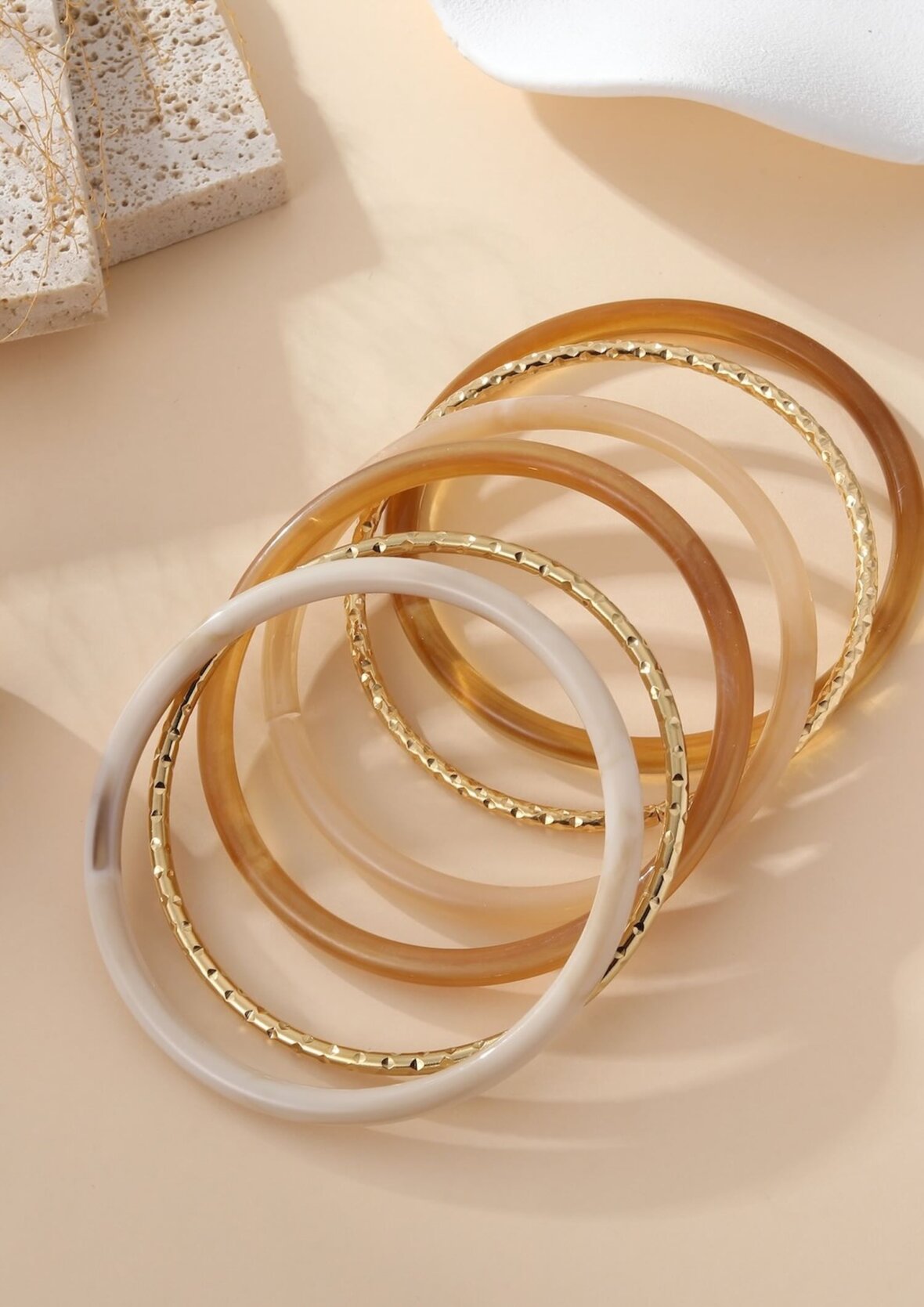 Elegant sæt af armbånd i smukke varme nuancer af beige, creme og gyldne detaljer. Kombinationen af matte og let transparente overflader skaber et eksklusivt og moderne udtryk.
