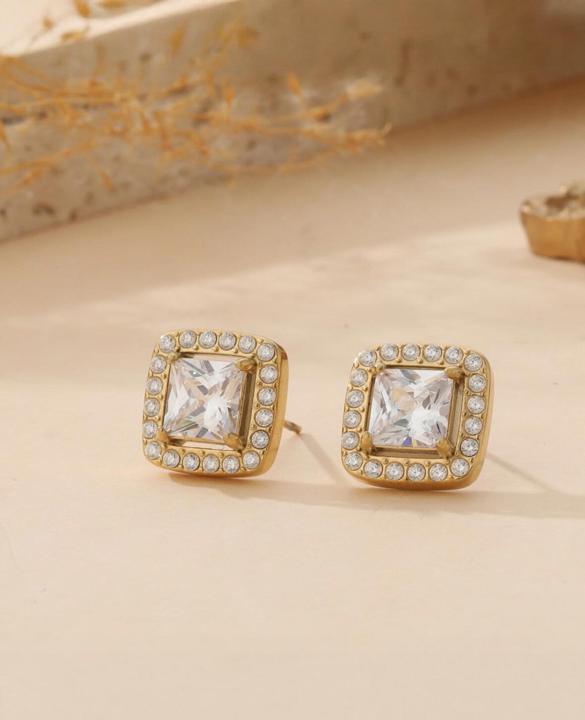 Elegante øreringe i et klassisk firkantet design med en smuk klar sten i centrum, omgivet af fine funklende detaljer. Kombinationen af guld og krystaller skaber et eksklusivt og tidløst udtryk.