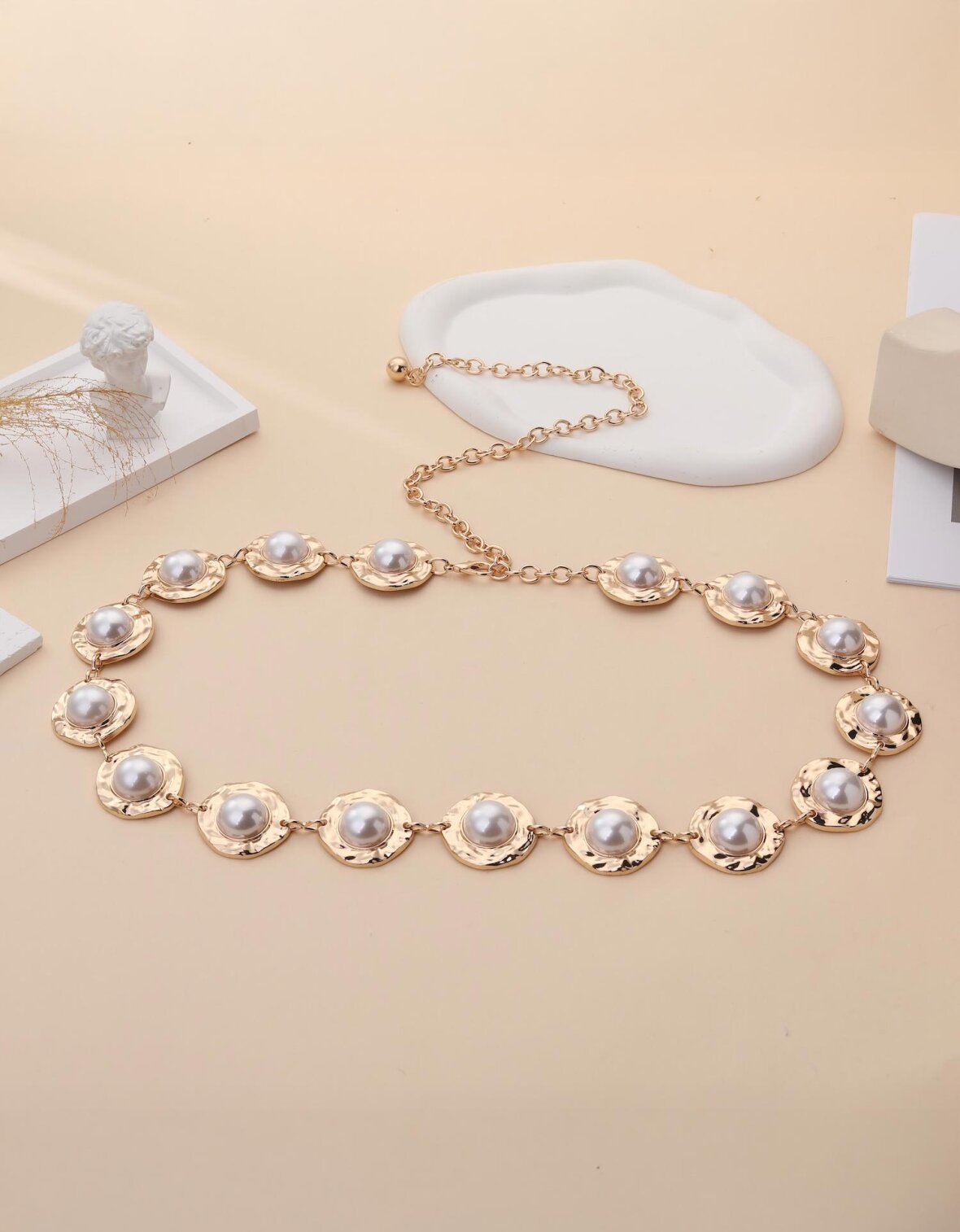 Et elegant kædebælte i gyldne nuancer med smukke perledetaljer, der skaber et eksklusivt og feminint udtryk. De runde elementer med perler giver et sofistikeret spil og tilfører et luksuriøst touch til dit outfit.