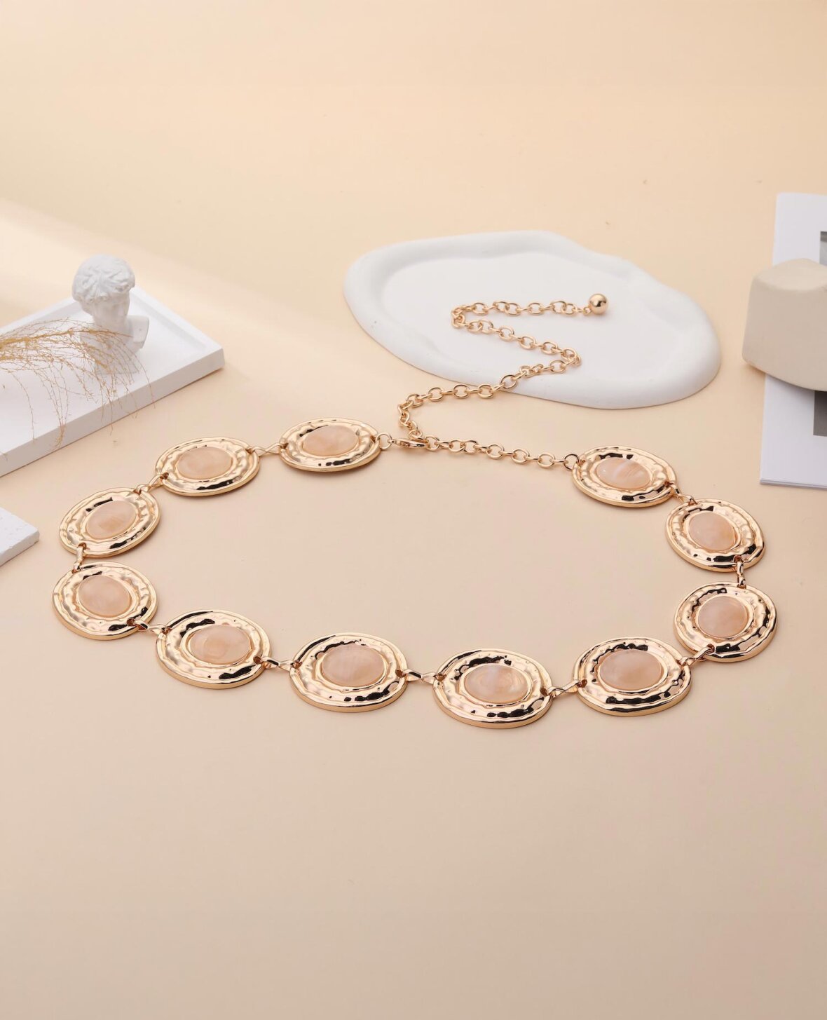Et elegant kædebælte i gyldne nuancer med smukke, lyse sten, der giver et blødt og eksklusivt udtryk. De runde elementer skaber en harmonisk balance mellem struktur og femininitet.