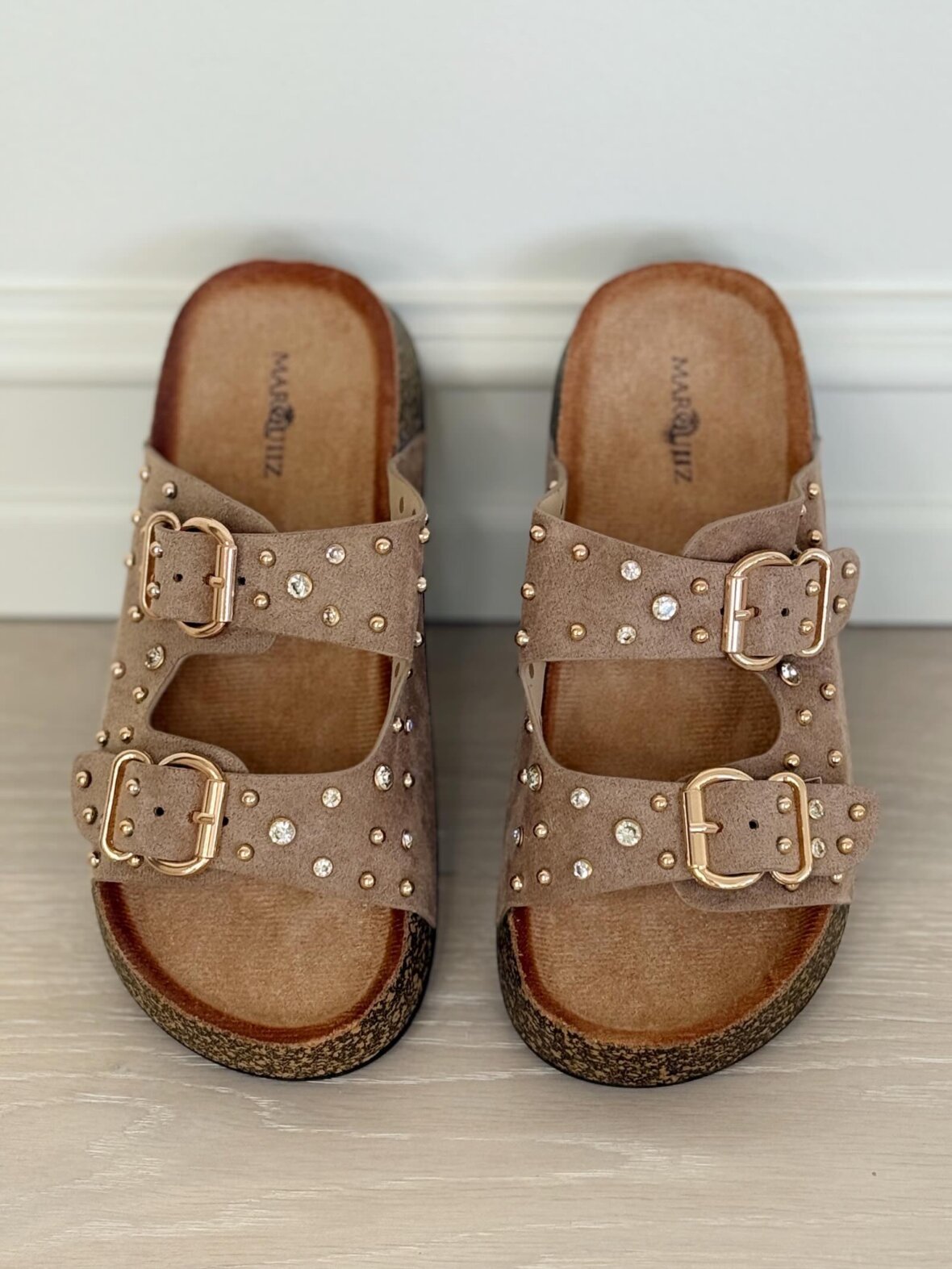 Khaki sandaler til dame med spænder og dekorative sten, der giver et råt og moderne look. De komfortable slip-on sandaler har en blød sål, som sikrer god støtte hele dagen. De justerbare spænder giver en fleksibel pasform, mens de fine detaljer tilfører et eksklusivt touch. Perfekte som sommer sandaler, hverdagssandaler eller til casual outfits. Style dem med kjoler, shorts eller bukser for et stilrent og afslappet look.