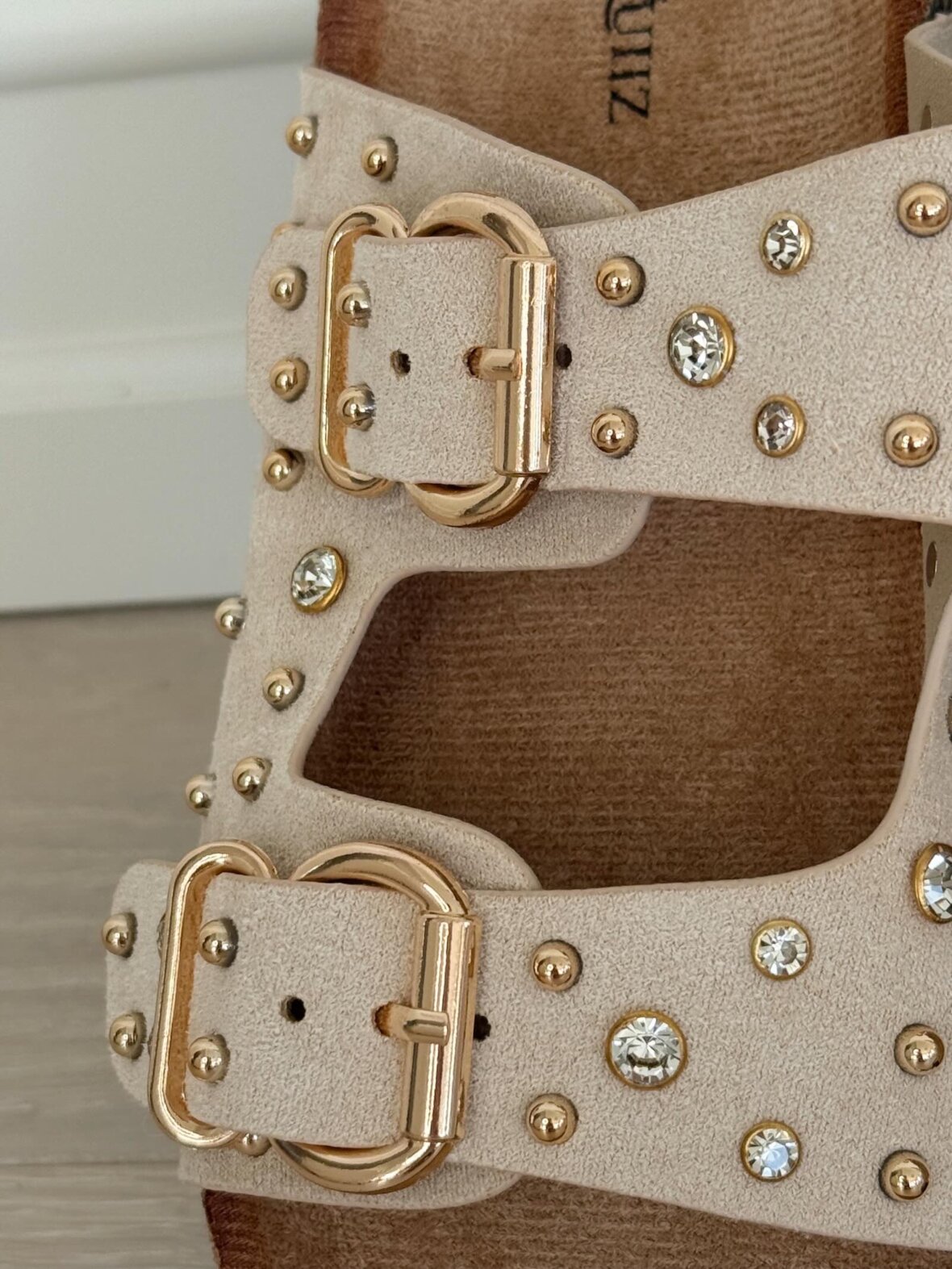 Beige sandaler til dame med spænder og dekorative sten, der skaber et elegant og trendy look. De komfortable slip-on sandaler har en blød sål, som sikrer god støtte hele dagen. De justerbare spænder giver en fleksibel pasform, mens de fine detaljer tilfører et eksklusivt touch. Perfekte som sommer sandaler, hverdagssandaler eller til ferielooks. Style dem med kjoler, shorts eller bukser for et afslappet og stilfuldt outfit.