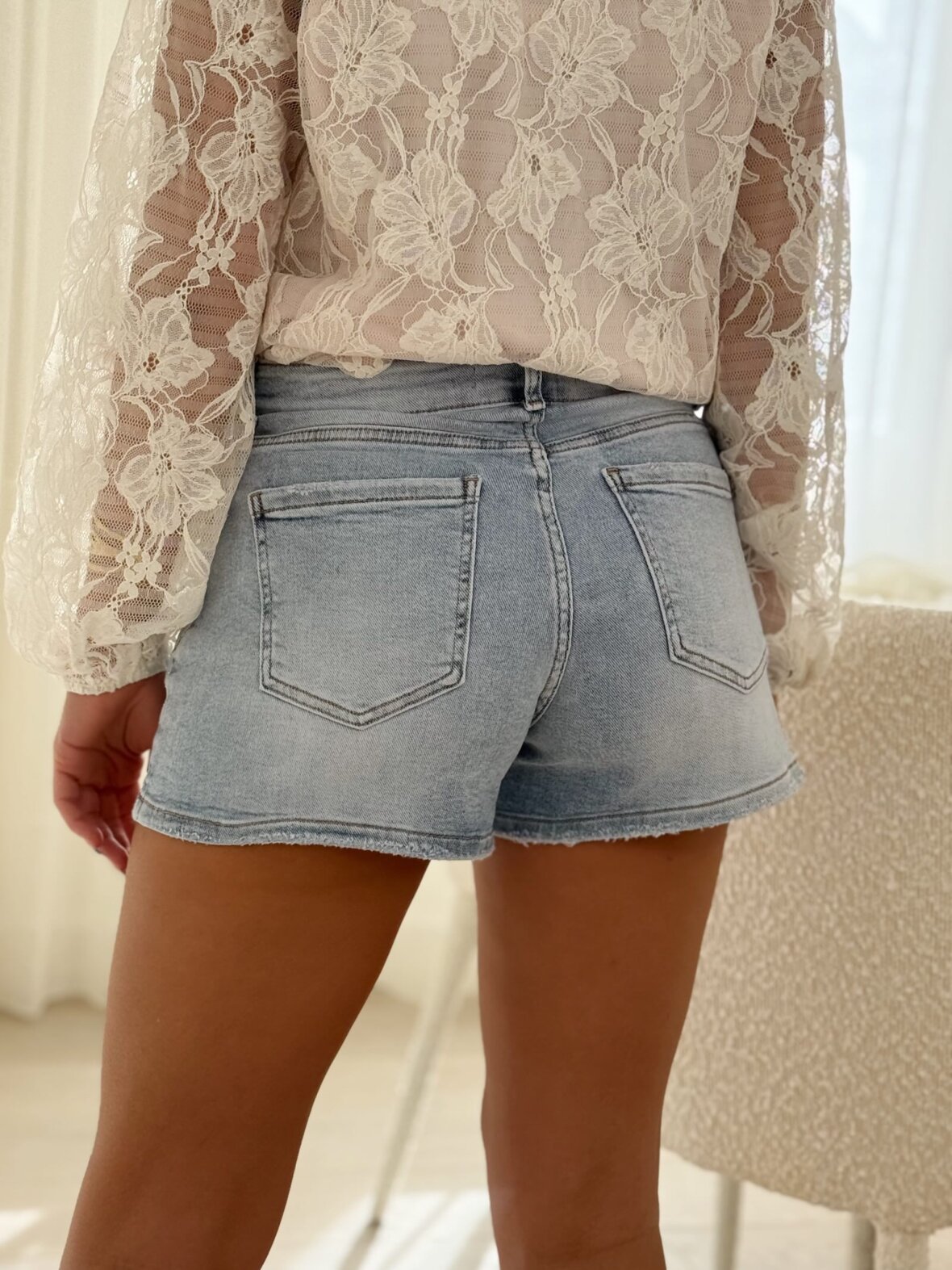 Lyse denim shorts med en flatterende pasform og fine glimmerdetaljer, der giver et elegant twist til et klassisk look. Designet har en behagelig stretch, som sikrer god komfort hele dagen, samt klassiske lommer og rå kant forneden. Perfekte til både hverdag og sommerens events, hvor du ønsker et casual, men stilfuldt udtryk.